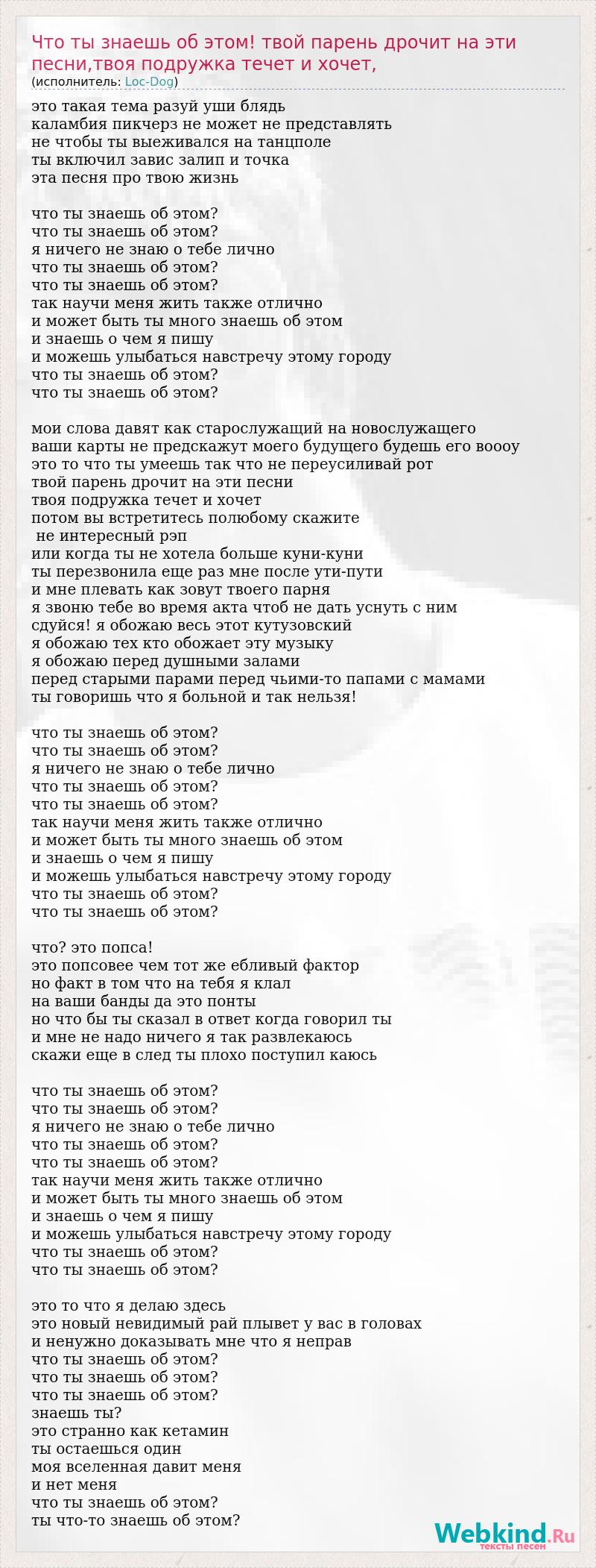 это такая тема разуй уши блядь каламбия пикчерз не может не представлять не чтобы ты выеживался на танцполе ты включил завис залип и точка эта песня про твою жизнь что ты знаешь об этом? что ты знаешь об этом? я ничего не знаю о тебе лично что ты знаешь об этом? что ты знаешь об этом? так научи меня жить также отлично и может быть ты много знаешь об этом и знаешь о чем я пишу и можешь улыбаться навстречу этому городу что ты знаешь об этом? что ты знаешь об этом? мои слова давят как старослужащий на новослужащего ваши карты не предскажут моего будущего будешь его воооу это то что ты умеешь так что не переусиливай рот твой парень дрочит на эти песни твоя подружка течет и хочет потом вы встретитесь полюбому скажите не интересный рэп или когда ты не хотела больше куни-куни ты перезвонила еще раз мне после ути-пути и мне плевать как зовут твоего парня я звоню тебе во время акта чтоб не дать уснуть с ним сдуйся! я обожаю весь этот кутузовский я обожаю тех кто обожает эту музыку я обожаю перед душными залами перед старыми парами перед чьими-то папами с мамами ты говоришь что я больной и так нельзя! что ты знаешь об этом? что ты знаешь об этом? я ничего не знаю о тебе лично что ты знаешь об этом? что ты знаешь об этом? так научи меня жить также отлично и может быть ты много знаешь об этом и знаешь о чем я пишу и можешь улыбаться навстречу этому городу что ты знаешь об этом? что ты знаешь об этом? что? это попса! это попсовее чем тот же ебливый фактор но факт в том что на тебя я клал на ваши банды да это понты но что бы ты сказал в ответ когда говорил ты и мне не надо ничего я так развлекаюсь скажи еще в след ты плохо поступил каюсь что ты знаешь об этом? что ты знаешь об этом? я ничего не знаю о тебе лично что ты знаешь об этом? что ты знаешь об этом? так научи меня жить также отлично и может быть ты много знаешь об этом и знаешь о чем я пишу и можешь улыбаться навстречу этому городу что ты знаешь об этом? что ты знаешь об этом? это то что я делаю здесь это новый невидимый рай плывет у вас в головах и ненужно доказывать мне что я неправ что ты знаешь об этом? что ты знаешь об этом? что ты знаешь об этом? знаешь ты? это странно как кетамин ты остаешься один моя вселенная давит меня и нет меня что ты знаешь об этом? ты что-то знаешь об этом?
