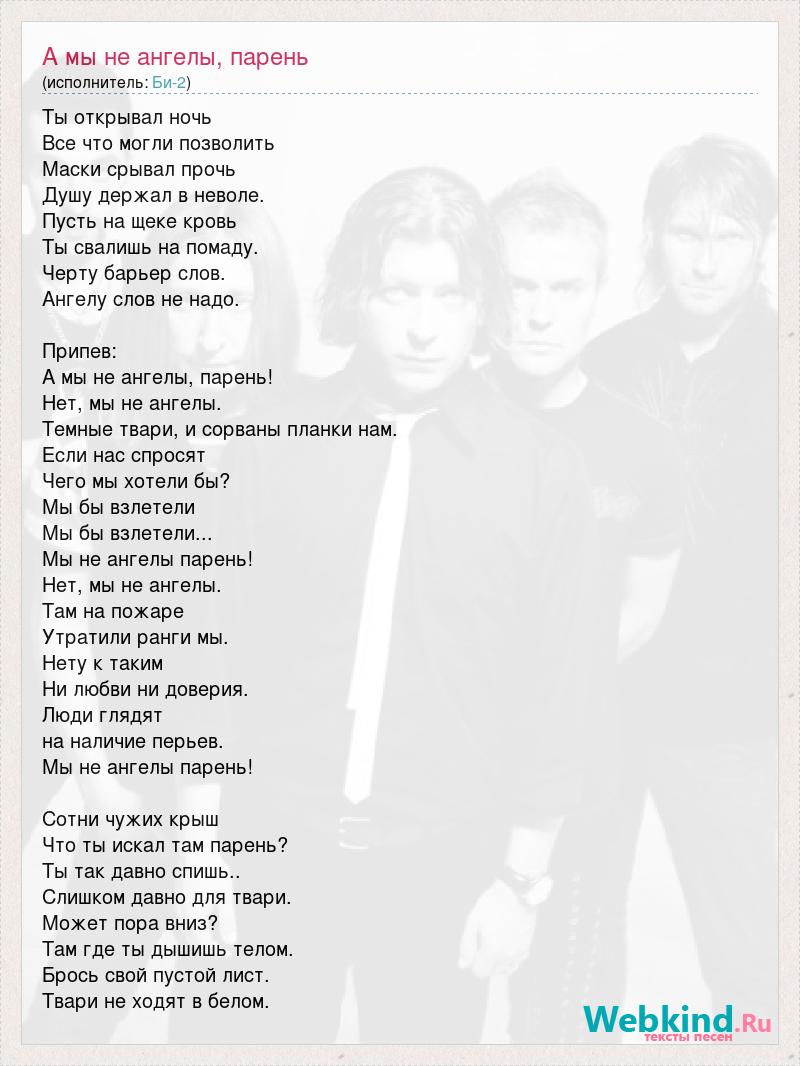 Ты открывал ночь Все что могли позволить Маски срывал прочь Душу держал в неволе. Пусть на щеке кровь Ты свалишь на помаду. Черту барьер слов. Ангелу слов не надо. Припев: А мы не ангелы, парень! Нет, мы не ангелы. Темные твари, и сорваны планки нам. Если нас спросят Чего мы хотели бы? Мы бы взлетели Мы бы взлетели... Мы не ангелы парень! Нет, мы не ангелы. Там на пожаре Утратили ранги мы. Нету к таким Ни любви ни доверия. Люди глядят на наличие перьев. Мы не ангелы парень! Сотни чужих крыш Что ты искал там парень? Ты так давно спишь.. Слишком давно для твари. Может пора вниз? Там где ты дышишь телом. Брось свой пустой лист. Твари не ходят в белом.