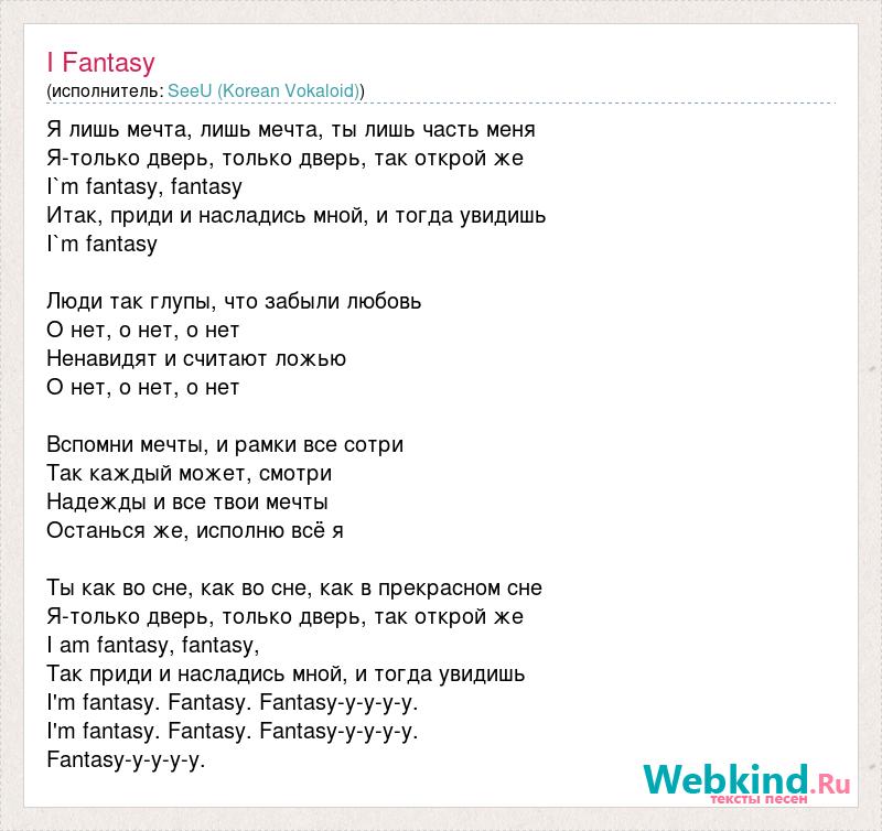 Я лишь мечта, лишь мечта, ты лишь часть меня Я-только дверь, только дверь, так открой же I`m fantasy, fantasy Итак, приди и насладись мной, и тогда увидишь I`m fantasy Люди так глупы, что забыли любовь О нет, о нет, о нет Ненавидят и считают ложью О нет, о нет, о нет Вспомни мечты, и рамки все сотри Так каждый может, смотри Надежды и все твои мечты Останься же, исполню всё я Ты как во сне, как во сне, как в прекрасном сне Я-только дверь, только дверь, так открой же I am fantasy, fantasy, Так приди и насладись мной, и тогда увидишь I'm fantasy. Fantasy. Fantasy-y-y-y-y. I'm fantasy. Fantasy. Fantasy-y-y-y-y. Fantasy-y-y-y-y.