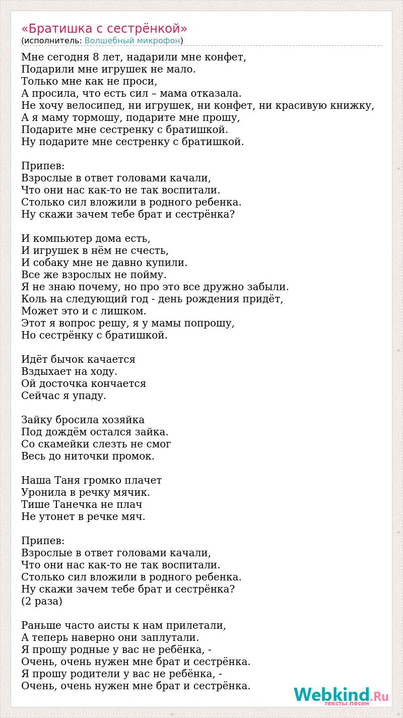 Мне сегодня 8 лет, надарили мне конфет, Подарили мне игрушек не мало. Только мне как не проси, А просила, что есть сил – мама отказала. Не хочу велосипед, ни игрушек, ни конфет, ни красивую книжку, А я маму тормошу, подарите мне прошу, Подарите мне сестренку с братишкой. Ну подарите мне сестренку с братишкой. Припев: Взрослые в ответ головами качали, Что они нас как-то не так воспитали. Столько сил вложили в родного ребенка. Ну скажи зачем тебе брат и сестрёнка? И компьютер дома есть, И игрушек в нём не счесть, И собаку мне не давно купили. Все же взрослых не пойму. Я не знаю почему, но про это все дружно забыли. Коль на следующий год - день рождения придёт, Может это и с лишком. Этот я вопрос решу, я у мамы попрошу, Но сестрёнку с братишкой. Идёт бычок качается Вздыхает на ходу. Ой досточка кончается Сейчас я упаду. Зайку бросила хозяйка Под дождём остался зайка. Со скамейки слезть не смог Весь до ниточки промок. Наша Таня громко плачет Уронила в речку мячик. Тише Танечка не плач Не утонет в речке мяч. Припев: Взрослые в ответ головами качали, Что они нас как-то не так воспитали. Столько сил вложили в родного ребенка. Ну скажи зачем тебе брат и сестрёнка? (2 раза) Раньше часто аисты к нам прилетали, А теперь наверно они заплутали. Я прошу родные у вас не ребёнка, - Очень, очень нужен мне брат и сестрёнка. Я прошу родители у вас не ребёнка, - Очень, очень нужен мне брат и сестрёнка.