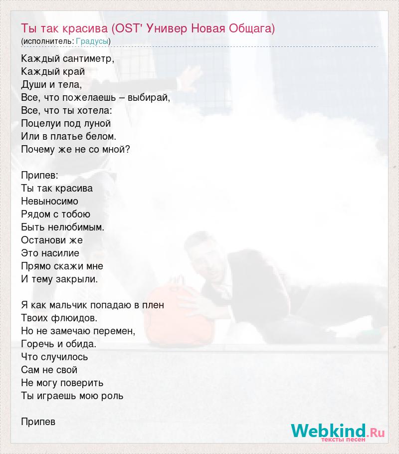 Каждый сантиметр, Каждый край Души и тела, Все, что пожелаешь – выбирай, Все, что ты хотела: Поцелуи под луной Или в платье белом. Почему же не со мной? Припев: Ты так красива Невыносимо Рядом с тобою Быть нелюбимым. Останови же Это насилие Прямо скажи мне И тему закрыли. Я как мальчик попадаю в плен Твоих флюидов. Но не замечаю перемен, Горечь и обида. Что случилось Сам не свой Не могу поверить Ты играешь мою роль Припев