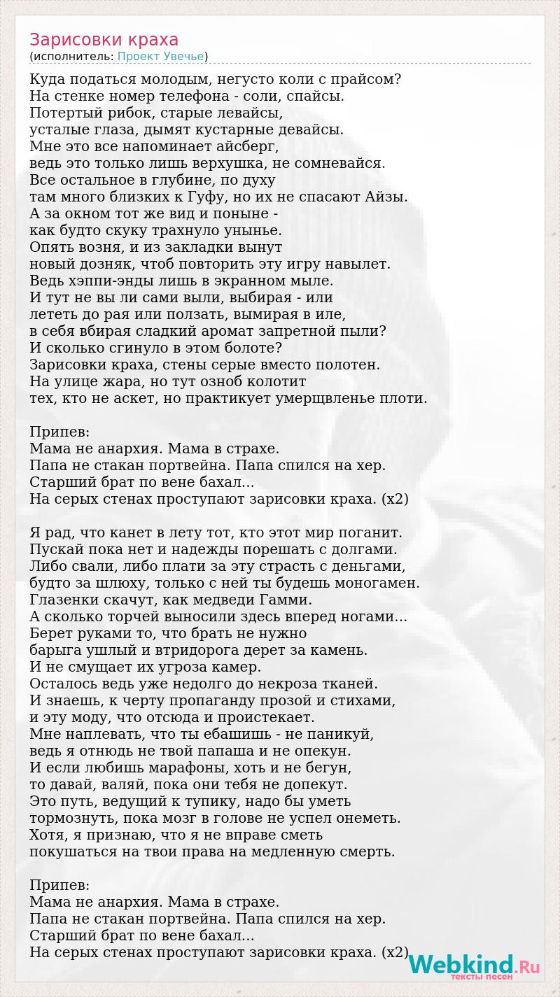 Куда податься молодым, негусто коли с прайсом? На стенке номер телефона - соли, спайсы. Потертый рибок, старые левайсы, усталые глаза, дымят кустарные девайсы. Мне это все напоминает айсберг, ведь это только лишь верхушка, не сомневайся. Все остальное в глубине, по духу там много близких к Гуфу, но их не спасают Айзы. А за окном тот же вид и поныне - как будто скуку трахнуло унынье. Опять возня, и из закладки вынут новый дозняк, чтоб повторить эту игру навылет. Ведь хэппи-энды лишь в экранном мыле. И тут не вы ли сами выли, выбирая - или лететь до рая или ползать, вымирая в иле, в себя вбирая сладкий аромат запретной пыли? И сколько сгинуло в этом болоте? Зарисовки краха, стены серые вместо полотен. На улице жара, но тут озноб колотит тех, кто не аскет, но практикует умерщвленье плоти. Припев: Мама не анархия. Мама в страхе. Папа не стакан портвейна. Папа спился на хер. Старший брат по вене бахал... На серых стенах проступают зарисовки краха. (х2) Я рад, что канет в лету тот, кто этот мир поганит. Пускай пока нет и надежды порешать с долгами. Либо свали, либо плати за эту страсть с деньгами, будто за шлюху, только с ней ты будешь моногамен. Глазенки скачут, как медведи Гамми. А сколько торчей выносили здесь вперед ногами... Берет руками то, что брать не нужно барыга ушлый и втридорога дерет за камень. И не смущает их угроза камер. Осталось ведь уже недолго до некроза тканей. И знаешь, к черту пропаганду прозой и стихами, и эту моду, что отсюда и проистекает. Мне наплевать, что ты ебашишь - не паникуй, ведь я отнюдь не твой папаша и не опекун. И если любишь марафоны, хоть и не бегун, то давай, валяй, пока они тебя не допекут. Это путь, ведущий к тупику, надо бы уметь тормознуть, пока мозг в голове не успел онеметь. Хотя, я признаю, что я не вправе сметь покушаться на твои права на медленную смерть. Припев: Мама не анархия. Мама в страхе. Папа не стакан портвейна. Папа спился на хер. Старший брат по вене бахал... На серых стенах проступают зарисовки краха. (х2)