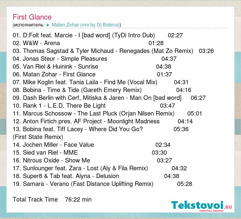 01. D:Folt feat. Marcie - I Come Running (TyDi Intro Dub) 02:27 02. W&W - Arena 01:28 03. Thomas Sagstad & Tyler Michaud - Renegades (Mat Zo Remix) 03:26 04. Jonas Steur - Simple Pleasures 04:37 05. Van Riel & Huinink - Sunrise 04:38 06. Matan Zohar - First Glance 01:37 07. Mike Koglin feat. Tania Laila - Find Me (Vocal Mix) 04:31 08. Bobina - Time & Tide (Gareth Emery Remix) 04:16 09. Dash Berlin with Cerf, Mitiska & Jaren - Man On The Run 06:27 10. Rank 1 - L.E.D. There Be Light 03:47 11. Marcus Schossow - The Last Pluck (Orjan Nilsen Remix) 05:01 12. Anton Firtich pres. AF Project - Moonlight Madness 04:14 13. Bobina feat. Tiff Lacey - Where Did You Go? 05:36 (First State Remix) 14. Jochen Miller - Face Value 02:34 15. Sied van Riel - MME 03:30 16. Nitrous Oxide - Show Me 03:27 17. Sunlounger feat. Zara - Lost (Aly & Fila Remix) 04:32 18. Super8 & Tab feat. Alyna - Delusion 04:38 19. Samara - Verano (Fast Distance Uplifting Remix) 05:28 Total Track Time 76:22 min