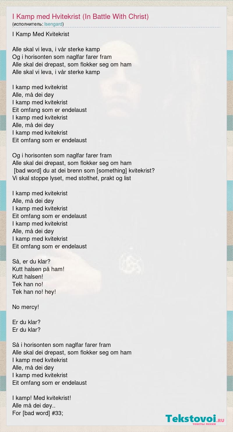 I Kamp Med Kvitekrist Alle skal vi leva, i vår sterke kamp Og i horisonten som naglfar farer fram Alle skal dei drepast, som flokker seg om ham Alle skal vi leva, i vår sterke kamp I kamp med kvitekrist Alle, må dei døy I kamp med kvitekrist Eit omfang som er endelaust I kamp med kvitekrist Alle, må dei døy I kamp med kvitekrist Eit omfang som er endelaust Og i horisonten som naglfar farer fram Alle skal dei drepast, som flokker seg om ham Trur du at dei brenn som [something] kvitekrist? Vi skal stoppe lyset, med stolthet, prakt og list I kamp med kvitekrist Alle, må dei døy I kamp med kvitekrist Eit omfang som er endelaust I kamp med kvitekrist Alle, må dei døy I kamp med kvitekrist Eit omfang som er endelaust Så, er du klar? Kutt halsen på ham! Kutt halsen! Tek han no! Tek han no! hey! No mercy! Er du klar? Er du klar? Så i horisonten som naglfar farer fram Alle skal dei drepast, som flokker seg om ham I kamp med kvitekrist Alle, må dei døy I kamp med kvitekrist Eit omfang som er endelaust I kamp! Med kvitekrist! Alle må dei døy.. For [bad word] #33;
