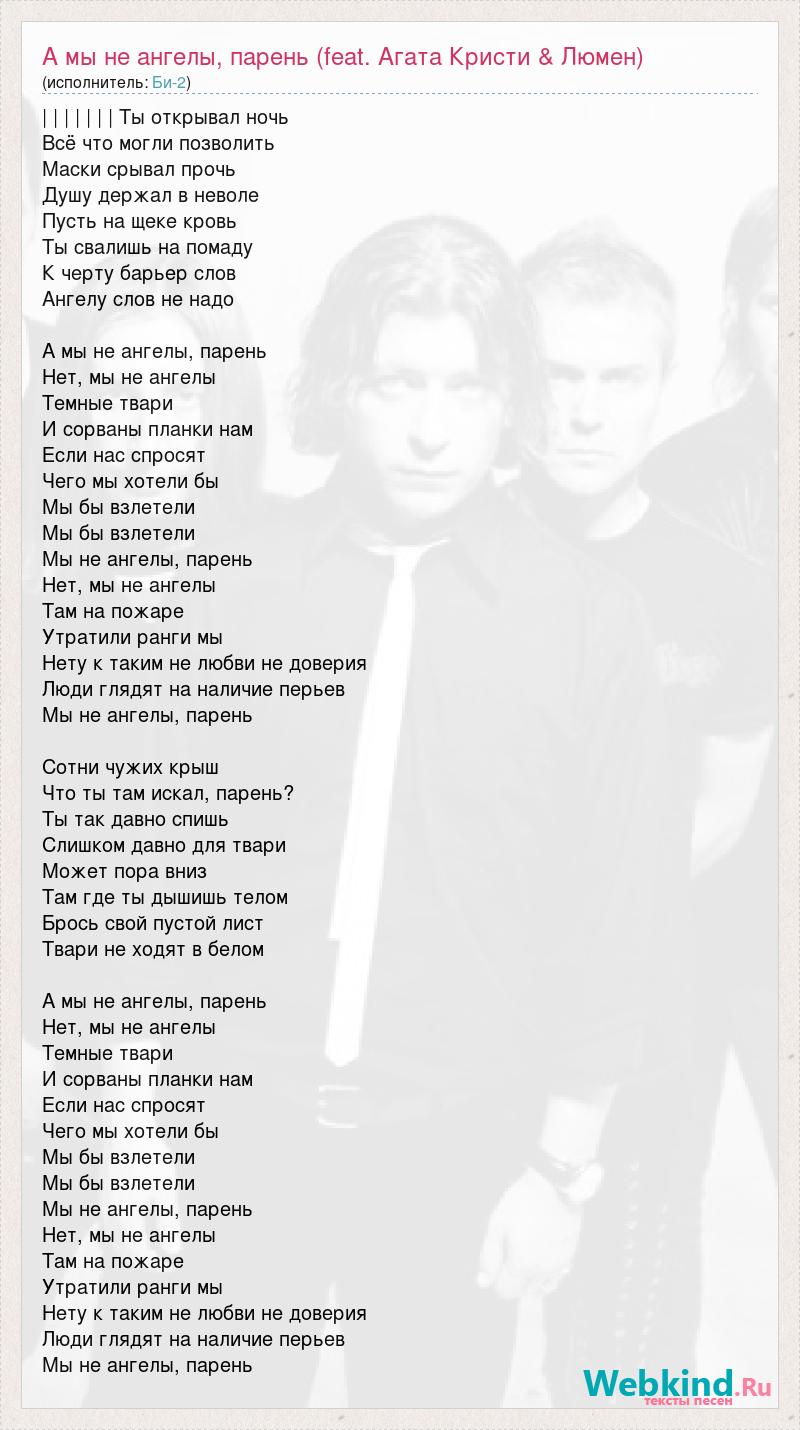 | | | | | | | Ты открывал ночь Всё что могли позволить Маски срывал прочь Душу держал в неволе Пусть на щеке кровь Ты свалишь на помаду К черту барьер слов Ангелу слов не надо А мы не ангелы, парень Нет, мы не ангелы Темные твари И сорваны планки нам Если нас спросят Чего мы хотели бы Мы бы взлетели Мы бы взлетели Мы не ангелы, парень Нет, мы не ангелы Там на пожаре Утратили ранги мы Нету к таким не любви не доверия Люди глядят на наличие перьев Мы не ангелы, парень Сотни чужих крыш Что ты там искал, парень? Ты так давно спишь Слишком давно для твари Может пора вниз Там где ты дышишь телом Брось свой пустой лист Твари не ходят в белом А мы не ангелы, парень Нет, мы не ангелы Темные твари И сорваны планки нам Если нас спросят Чего мы хотели бы Мы бы взлетели Мы бы взлетели Мы не ангелы, парень Нет, мы не ангелы Там на пожаре Утратили ранги мы Нету к таким не любви не доверия Люди глядят на наличие перьев Мы не ангелы, парень