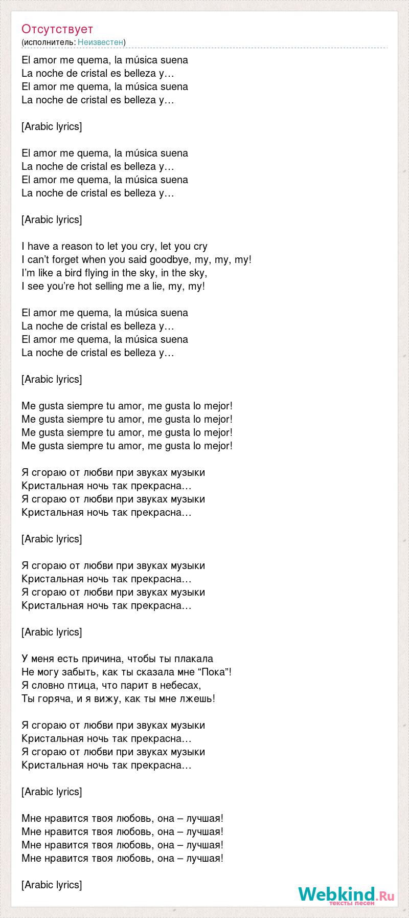 El amor me quema, la música suena La noche de cristal es belleza y… El amor me quema, la música suena La noche de cristal es belleza y… [Arabic lyrics] El amor me quema, la música suena La noche de cristal es belleza y… El amor me quema, la música suena La noche de cristal es belleza y… [Arabic lyrics] I have a reason to let you cry, let you cry I can’t forget when you said goodbye, my, my, my! I’m like a bird flying in the sky, in the sky, I see you’re hot selling me a lie, my, my! El amor me quema, la música suena La noche de cristal es belleza y… El amor me quema, la música suena La noche de cristal es belleza y… [Arabic lyrics] Me gusta siempre tu amor, me gusta lo mejor! Me gusta siempre tu amor, me gusta lo mejor! Me gusta siempre tu amor, me gusta lo mejor! Me gusta siempre tu amor, me gusta lo mejor! Я сгораю от любви при звуках музыки Кристальная ночь так прекрасна… Я сгораю от любви при звуках музыки Кристальная ночь так прекрасна… [Arabic lyrics] Я сгораю от любви при звуках музыки Кристальная ночь так прекрасна… Я сгораю от любви при звуках музыки Кристальная ночь так прекрасна… [Arabic lyrics] У меня есть причина, чтобы ты плакала Не могу забыть, как ты сказала мне “Пока”! Я словно птица, что парит в небесах, Ты горяча, и я вижу, как ты мне лжешь! Я сгораю от любви при звуках музыки Кристальная ночь так прекрасна… Я сгораю от любви при звуках музыки Кристальная ночь так прекрасна… [Arabic lyrics] Мне нравится твоя любовь, она – лучшая! Мне нравится твоя любовь, она – лучшая! Мне нравится твоя любовь, она – лучшая! Мне нравится твоя любовь, она – лучшая! [Arabic lyrics]