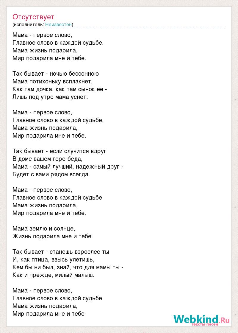 Мама - первое слово, Главное слово в каждой судьбе. Мама жизнь подарила, Мир подарила мне и тебе. Так бывает - ночью бессонною Мама потихоньку всплакнет, Как там дочка, как там сынок ее - Лишь под утро мама уснет. Мама - первое слово, Главное слово в каждой судьбе. Мама жизнь подарила, Мир подарила мне и тебе. Так бывает - если случится вдруг В доме вашем горе-беда, Мама - самый лучший, надежный друг - Будет с вами рядом всегда. Мама - первое слово, Главное слово в каждой судьбе Мама жизнь подарила, Мир подарила мне и тебе. Мама землю и солнце, Жизнь подарила мне и тебе. Так бывает - станешь взрослее ты И, как птица, ввысь улетишь, Кем бы ни был, знай, что для мамы ты - Как и прежде, милый малыш. Мама - первое слово, Главное слово в каждой судьбе Мама жизнь подарила, Мир подарила мне и тебе