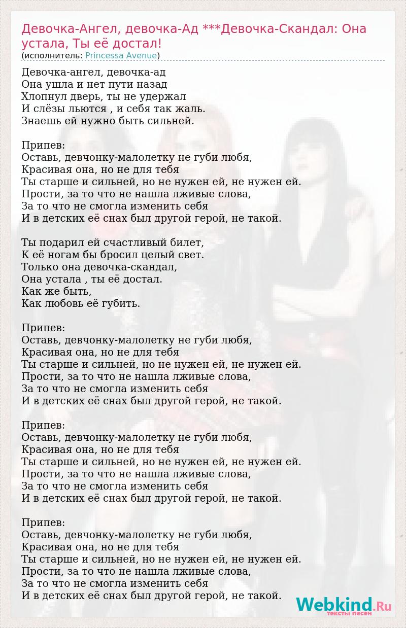 Девочка-ангел, девочка-ад Она ушла и нет пути назад Хлопнул дверь, ты не удержал И слёзы льются , и себя так жаль. Знаешь ей нужно быть сильней. Припев: Оставь, девчонку-малолетку не губи любя, Красивая она, но не для тебя Ты старше и сильней, но не нужен ей, не нужен ей. Прости, за то что не нашла лживые слова, За то что не смогла изменить себя И в детских её снах был другой герой, не такой. Ты подарил ей счастливый билет, К её ногам бы бросил целый свет. Только она девочка-скандал, Она устала , ты её достал. Как же быть, Как любовь её губить. Припев: Оставь, девчонку-малолетку не губи любя, Красивая она, но не для тебя Ты старше и сильней, но не нужен ей, не нужен ей. Прости, за то что не нашла лживые слова, За то что не смогла изменить себя И в детских её снах был другой герой, не такой. Припев: Оставь, девчонку-малолетку не губи любя, Красивая она, но не для тебя Ты старше и сильней, но не нужен ей, не нужен ей. Прости, за то что не нашла лживые слова, За то что не смогла изменить себя И в детских её снах был другой герой, не такой. Припев: Оставь, девчонку-малолетку не губи любя, Красивая она, но не для тебя Ты старше и сильней, но не нужен ей, не нужен ей. Прости, за то что не нашла лживые слова, За то что не смогла изменить себя И в детских её снах был другой герой, не такой.