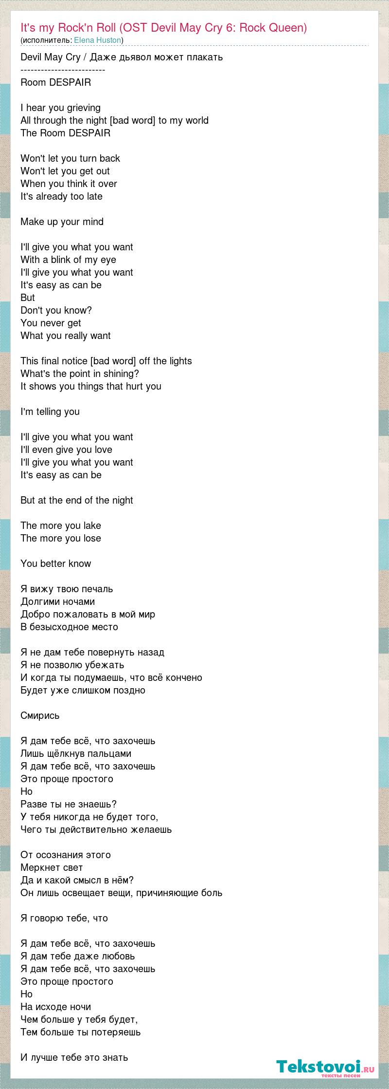 Devil May Cry / Даже дьявол может плакать ------------------------- Room DESPAIR I hear you grieving All through the night Welcome to my world The Room DESPAIR Won't let you turn back Won't let you get out When you think it over It's already too late Make up your mind I'll give you what you want With a blink of my eye I'll give you what you want It's easy as can be But Don't you know? You never get What you really want This final notice Turus off the lights What's the point in shining? It shows you things that hurt you I'm telling you I'll give you what you want I'll even give you love I'll give you what you want It's easy as can be But at the end of the night The more you lake The more you lose You better know Я вижу твою печаль Долгими ночами Добро пожаловать в мой мир В безысходное место Я не дам тебе повернуть назад Я не позволю убежать И когда ты подумаешь, что всё кончено Будет уже слишком поздно Смирись Я дам тебе всё, что захочешь Лишь щёлкнув пальцами Я дам тебе всё, что захочешь Это проще простого Но Разве ты не знаешь? У тебя никогда не будет того, Чего ты действительно желаешь От осознания этого Меркнет свет Да и какой смысл в нём? Он лишь освещает вещи, причиняющие боль Я говорю тебе, что Я дам тебе всё, что захочешь Я дам тебе даже любовь Я дам тебе всё, что захочешь Это проще простого Но На исходе ночи Чем больше у тебя будет, Тем больше ты потеряешь И лучше тебе это знать