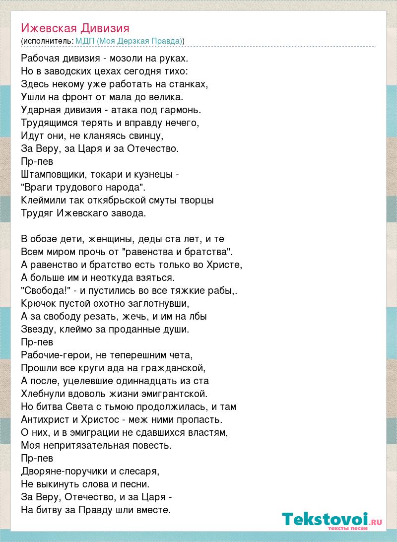Рабочая дивизия - мозоли на руках. Но в заводских цехах сегодня тихо: Здесь некому уже работать на станках, Ушли на фронт от мала до велика. Ударная дивизия - атака под гармонь. Трудящимся терять и вправду нечего, Идут они, не кланяясь свинцу, За Веру, за Царя и за Отечество. Пр-пев Штамповщики, токари и кузнецы - "Враги трудового народа". Клеймили так откябрьской смуты творцы Трудяг Ижевскаго завода. В обозе дети, женщины, деды ста лет, и те Всем миром прочь от "равенства и братства". А равенство и братство есть только во Христе, А больше им и неоткуда взяться. "Свобода!" - и пустились во все тяжкие рабы,. Крючок пустой охотно заглотнувши, А за свободу резать, жечь, и им на лбы Звезду, клеймо за проданные души. Пр-пев Рабочие-герои, не теперешним чета, Прошли все круги ада на гражданской, А после, уцелевшие одиннадцать из ста Хлебнули вдоволь жизни эмигрантской. Но битва Света с тьмою продолжилась, и там Антихрист и Христос - меж ними пропасть. О них, и в эмиграции не сдавшихся властям, Моя непритязательная повесть. Пр-пев Дворяне-поручики и слесаря, Не выкинуть слова и песни. За Веру, Отечество, и за Царя - На битву за Правду шли вместе.