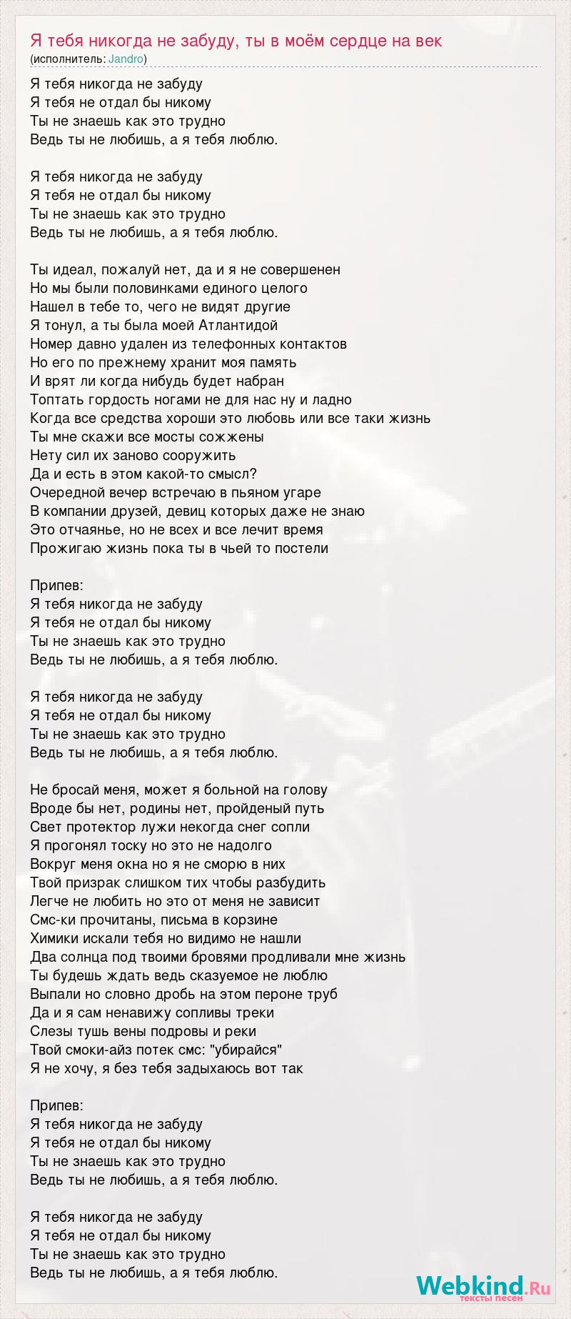 Я тебя никогда не забуду Я тебя не отдал бы никому Ты не знаешь как это трудно Ведь ты не любишь, а я тебя люблю. Я тебя никогда не забуду Я тебя не отдал бы никому Ты не знаешь как это трудно Ведь ты не любишь, а я тебя люблю. Ты идеал, пожалуй нет, да и я не совершенен Но мы были половинками единого целого Нашел в тебе то, чего не видят другие Я тонул, а ты была моей Атлантидой Номер давно удален из телефонных контактов Но его по прежнему хранит моя память И врят ли когда нибудь будет набран Топтать гордость ногами не для нас ну и ладно Когда все средства хороши это любовь или все таки жизнь Ты мне скажи все мосты сожжены Нету сил их заново сооружить Да и есть в этом какой-то смысл? Очередной вечер встречаю в пьяном угаре В компании друзей, девиц которых даже не знаю Это отчаянье, но не всех и все лечит время Прожигаю жизнь пока ты в чьей то постели Припев: Я тебя никогда не забуду Я тебя не отдал бы никому Ты не знаешь как это трудно Ведь ты не любишь, а я тебя люблю. Я тебя никогда не забуду Я тебя не отдал бы никому Ты не знаешь как это трудно Ведь ты не любишь, а я тебя люблю. Не бросай меня, может я больной на голову Вроде бы нет, родины нет, пройденый путь Свет протектор лужи некогда снег сопли Я прогонял тоску но это не надолго Вокруг меня окна но я не сморю в них Твой призрак слишком тих чтобы разбудить Легче не любить но это от меня не зависит Смс-ки прочитаны, письма в корзине Химики искали тебя но видимо не нашли Два солнца под твоими бровями продливали мне жизнь Ты будешь ждать ведь сказуемое не люблю Выпали но словно дробь на этом пероне труб Да и я сам ненавижу сопливы треки Слезы тушь вены подровы и реки Твой смоки-айз потек смс: "убирайся" Я не хочу, я без тебя задыхаюсь вот так Припев: Я тебя никогда не забуду Я тебя не отдал бы никому Ты не знаешь как это трудно Ведь ты не любишь, а я тебя люблю. Я тебя никогда не забуду Я тебя не отдал бы никому Ты не знаешь как это трудно Ведь ты не любишь, а я тебя люблю.