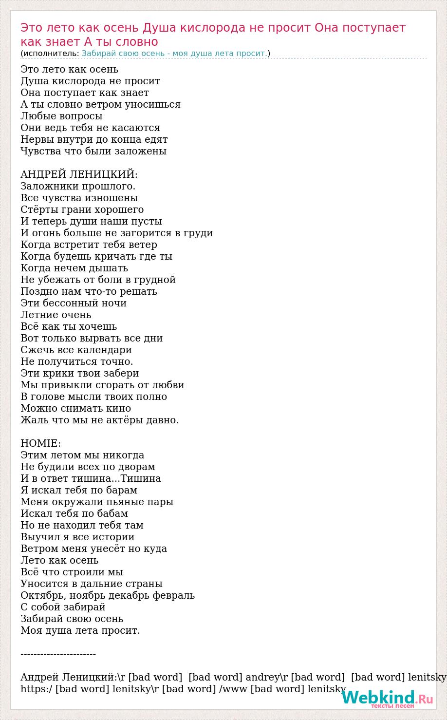 Это лето как осень Душа кислорода не просит Она поступает как знает А ты словно ветром уносишься Любые вопросы Они ведь тебя не касаются Нервы внутри до конца едят Чувства что были заложены АНДРЕЙ ЛЕНИЦКИЙ: Заложники прошлого. Все чувства изношены Стёрты грани хорошего И теперь души наши пусты И огонь больше не загорится в груди Когда встретит тебя ветер Когда будешь кричать где ты Когда нечем дышать Не убежать от боли в грудной Поздно нам что-то решать Эти бессонный ночи Летние очень Всё как ты хочешь Вот только вырвать все дни Сжечь все календари Не получиться точно. Эти крики твои забери Мы привыкли сгорать от любви В голове мысли твоих полно Можно снимать кино Жаль что мы не актёры давно. HOMIE: Этим летом мы никогда Не будили всех по дворам И в ответ тишина...Тишина Я искал тебя по барам Меня окружали пьяные пары Искал тебя по бабам Но не находил тебя там Выучил я все истории Ветром меня унесёт но куда Лето как осень Всё что строили мы Уносится в дальние страны Октябрь, ноябрь декабрь февраль С собой забирай Забирай свою осень Моя душа лета просит. ----------------------- Андрей Леницкий:\r [bad word] [bad word] andrey\r [bad word] [bad word] lenitsky https:/ [bad word] lenitsky\r [bad word] /www [bad word] lenitsky