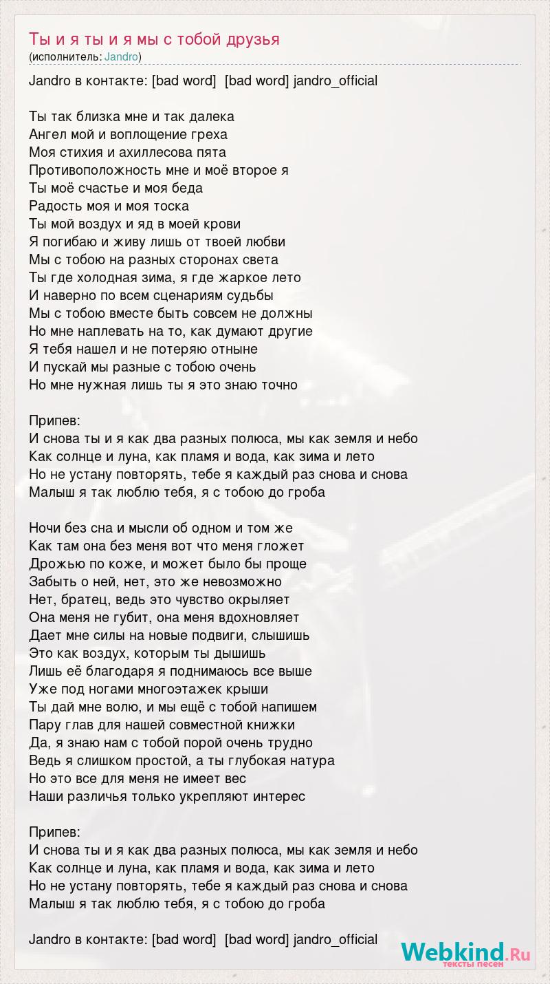 Jandro в контакте: [bad word] [bad word] jandro_official Ты так близка мне и так далека Ангел мой и воплощение греха Моя стихия и ахиллесова пята Противоположность мне и моё второе я Ты моё счастье и моя беда Радость моя и моя тоска Ты мой воздух и яд в моей крови Я погибаю и живу лишь от твоей любви Мы с тобою на разных сторонах света Ты где холодная зима, я где жаркое лето И наверно по всем сценариям судьбы Мы с тобою вместе быть совсем не должны Но мне наплевать на то, как думают другие Я тебя нашел и не потеряю отныне И пускай мы разные с тобою очень Но мне нужная лишь ты я это знаю точно Припев: И снова ты и я как два разных полюса, мы как земля и небо Как солнце и луна, как пламя и вода, как зима и лето Но не устану повторять, тебе я каждый раз снова и снова Малыш я так люблю тебя, я с тобою до гроба Ночи без сна и мысли об одном и том же Как там она без меня вот что меня гложет Дрожью по коже, и может было бы проще Забыть о ней, нет, это же невозможно Нет, братец, ведь это чувство окрыляет Она меня не губит, она меня вдохновляет Дает мне силы на новые подвиги, слышишь Это как воздух, которым ты дышишь Лишь её благодаря я поднимаюсь все выше Уже под ногами многоэтажек крыши Ты дай мне волю, и мы ещё с тобой напишем Пару глав для нашей совместной книжки Да, я знаю нам с тобой порой очень трудно Ведь я слишком простой, а ты глубокая натура Но это все для меня не имеет вес Наши различья только укрепляют интерес Припев: И снова ты и я как два разных полюса, мы как земля и небо Как солнце и луна, как пламя и вода, как зима и лето Но не устану повторять, тебе я каждый раз снова и снова Малыш я так люблю тебя, я с тобою до гроба Jandro в контакте: [bad word] [bad word] jandro_official