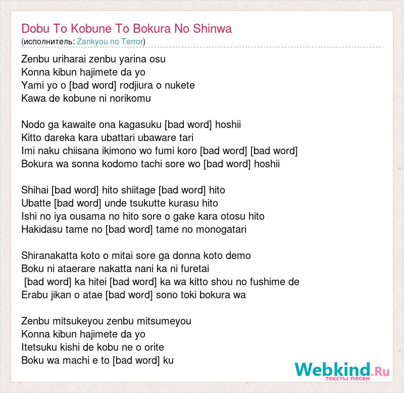 Zenbu uriharai zenbu yarina osu Konna kibun hajimete da yo Yami yo o [bad word] rodjiura o nukete Kawa de kobune ni norikomu Nodo ga kawaite ona kagasuku [bad word] hoshii Kitto dareka kara ubattari ubaware tari Imi naku chiisana ikimono wo fumi koro [bad word] [bad word] Bokura wa sonna kodomo tachi sore wo [bad word] hoshii Shihai [bad word] hito shiitage [bad word] hito Ubatte [bad word] unde tsukutte kurasu hito Ishi no iya ousama no hito sore o gake kara otosu hito Hakidasu tame no [bad word] tame no monogatari Shiranakatta koto o mitai sore ga donna koto demo Boku ni ataerare nakatta nani ka ni furetai [bad word] ka hitei [bad word] ka wa kitto shou no fushime de Erabu jikan o atae [bad word] sono toki bokura wa Zenbu mitsukeyou zenbu mitsumeyou Konna kibun hajimete da yo Itetsuku kishi de kobu ne o orite Boku wa machi e to [bad word] ku