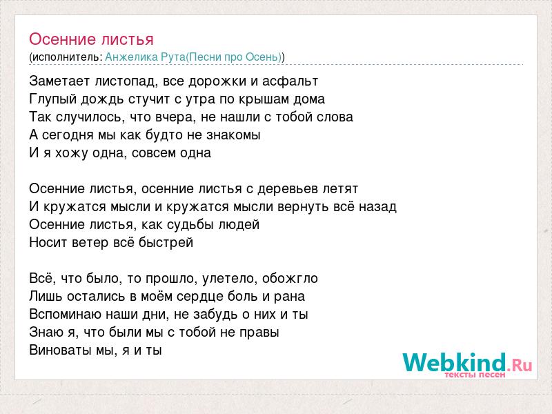 Заметает листопад, все дорожки и асфальт Глупый дождь стучит с утра по крышам дома Так случилось, что вчера, не нашли с тобой слова А сегодня мы как будто не знакомы И я хожу одна, совсем одна Осенние листья, осенние листья с деревьев летят И кружатся мысли и кружатся мысли вернуть всё назад Осенние листья, как судьбы людей Носит ветер всё быстрей Всё, что было, то прошло, улетело, обожгло Лишь остались в моём сердце боль и рана Вспоминаю наши дни, не забудь о них и ты Знаю я, что были мы с тобой не правы Виноваты мы, я и ты