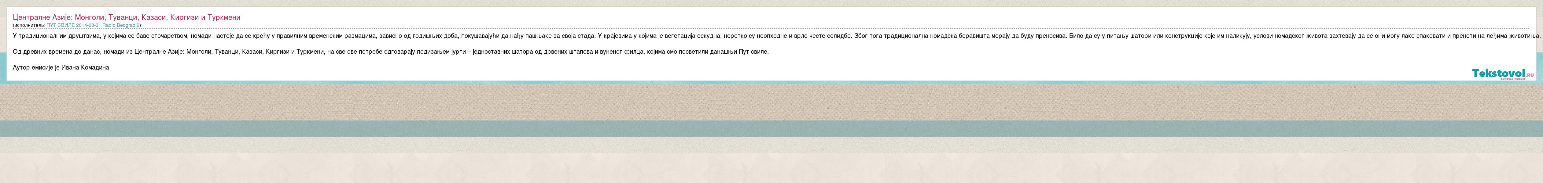 Главная→Исполнители→ПУТ СВИЛE 2014-08-31 Radio Beograd 2→Централне Азије: Монголи, Туванци, Казаси, Киргизи и Туркмени