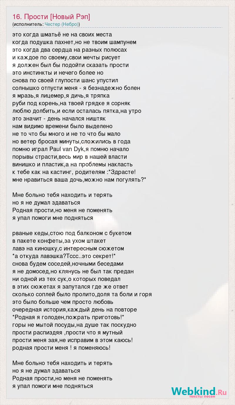 это когда шматьё не на своих места когда подушка пахнет,но не твоим шампунем это когда два сердца на разных полюсах и каждое по своему,свои мечты рисует я должен был бы подойти сказать прости это инстинкты и нечего более но снова по своей глупости шанс упустил солнышко отпусти меня - я безнадежно болен я мразь,я лицемер,я дичь,я тряпка руби под корень,на твоей грядке я сорняк люблю долбить,и если осталась пятка,на утро это значит - день начался ништяк нам видимо времени было выделено не то что бы много и не то что бы мало но ветер бросая минуты,сложились в года помню играл Paul van Dyk,я помню начало порывы страсти,весь мир в нашей власти винишко и пластик,а на проблемы накласть к тебе как на кастинг, родителям :*Здрасте! мне нравиться ваша дочь,можно нам погулять?* Мне больно тебя находить и терять но я не думал здаваться Родная прости,но меня не поменять я упал помоги мне подняться рваные кеды,стою под балконом с букетом в пакете конфеты,за ухом штакет лавэ на киношку,с интересным сюжетом *а откуда лавэшка?Тссс..это секрет!* снова будем соседей,ночными беседами я не домосед,но клянусь не был так предан ни одной из тех сук,о которых поведал в этих сюжетах я запутался где же ответ сколько соплей было пролито,доля та боли и горя это было больше чем просто любовь очередная история,каждый день на повторе *Родная я голоден,пожрать приготовь!* горы не мытой посуды,на душе так поскудно прости распиздяя ,прости что я мутный прости меня зая,не исправим в этом каюсь! родная прости меня ! я поменяюсь! Мне больно тебя находить и терять но я не думал здаваться Родная прости,но меня не поменять я упал помоги мне подняться