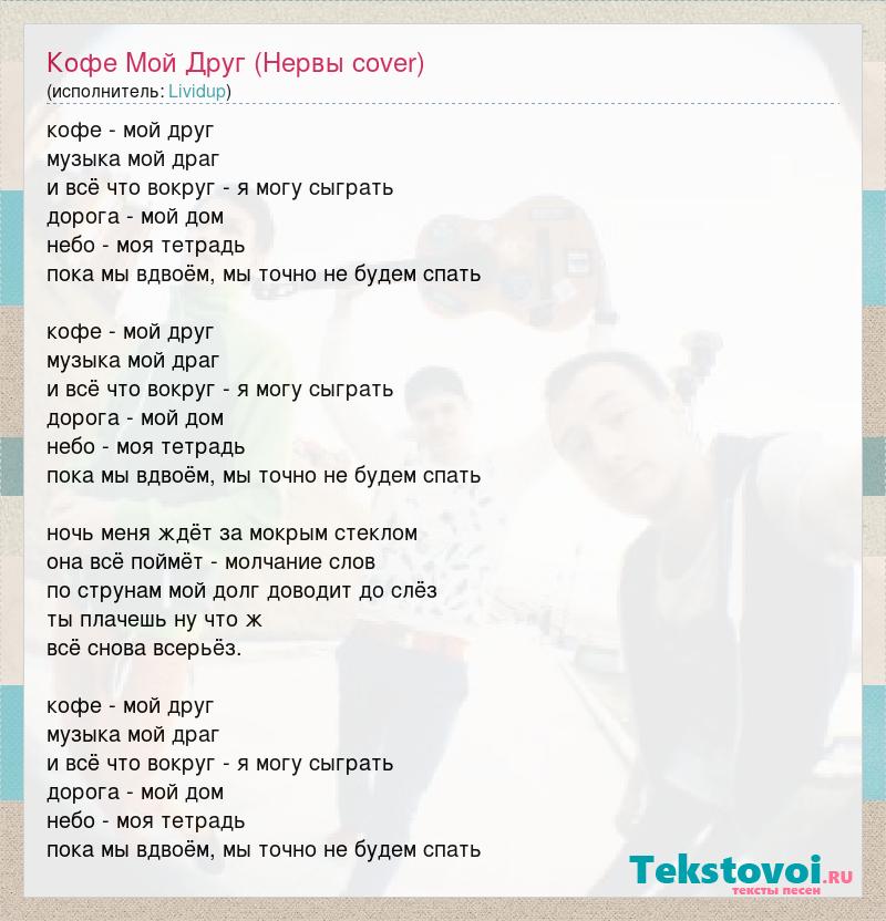 кофе - мой друг музыка мой драг и всё что вокруг - я могу сыграть дорога - мой дом небо - моя тетрадь пока мы вдвоём, мы точно не будем спать кофе - мой друг музыка мой драг и всё что вокруг - я могу сыграть дорога - мой дом небо - моя тетрадь пока мы вдвоём, мы точно не будем спать ночь меня ждёт за мокрым стеклом она всё поймёт - молчание слов по струнам мой долг доводит до слёз ты плачешь ну что ж всё снова всерьёз. кофе - мой друг музыка мой драг и всё что вокруг - я могу сыграть дорога - мой дом небо - моя тетрадь пока мы вдвоём, мы точно не будем спать