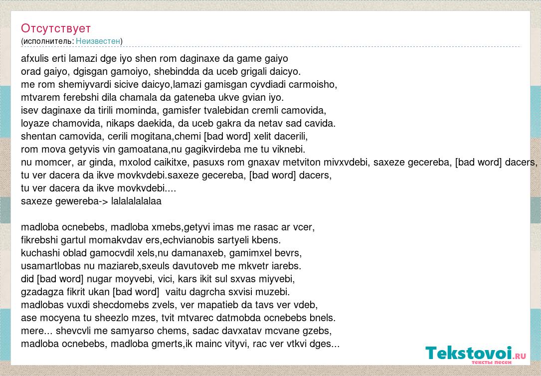 afxulis erti lamazi dge iyo shen rom daginaxe da game gaiyo orad gaiyo, dgisgan gamoiyo, shebindda da uceb grigali daicyo. me rom shemiyvardi sicive daicyo,lamazi gamisgan cyvdiadi carmoisho, mtvarem ferebshi dila chamala da gateneba ukve gvian iyo. isev daginaxe da tirili mominda, gamisfer tvalebidan cremli camovida, loyaze chamovida, nikaps daekida, da uceb gakra da netav sad cavida. shentan camovida, cerili mogitana,chemi siyvarulis xelit dacerili, rom mova getyvis vin gamoatana,nu gagikvirdeba me tu viknebi. nu momcer, ar ginda, mxolod caikitxe, pasuxs rom gnaxav metviton mivxvdebi, saxeze gecereba, siyvaruli dacers, tu ver dacera da ikve movkvdebi.saxeze gecereba, siyvaruli dacers, tu ver dacera da ikve movkvdebi.... saxeze gewereba-> lalalalalalaa madloba ocnebebs, madloba xmebs,getyvi imas me rasac ar vcer, fikrebshi gartul momakvdav ers,echvianobis sartyeli kbens. kuchashi oblad gamocvdil xels,nu damanaxeb, gamimxel bevrs, usamartlobas nu maziareb,sxeuls davutoveb me mkvetr iarebs. did siyvarulze nugar moyvebi, vici, kars ikit sul sxvas miyvebi, gzadagza fikrit ukan brundebi, vaitu dagrcha sxvisi muzebi. madlobas vuxdi shecdomebs zvels, ver mapatieb da tavs ver vdeb, ase mocyena tu sheezlo mzes, tvit mtvarec datmobda ocnebebs bnels. mere... shevcvli me samyarso chems, sadac davxatav mcvane gzebs, madloba ocnebebs, madloba gmerts,ik mainc vityvi, rac ver vtkvi dges...
