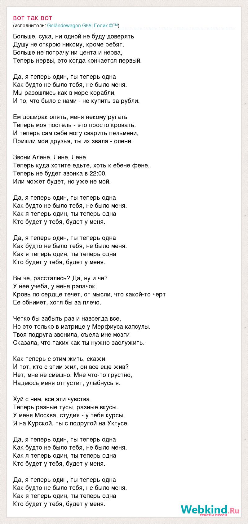 Больше, сука, ни одной не буду доверять Душу не открою никому, кроме ребят. Больше не потрачу ни цента и нерва, Теперь нервы, это когда кончается первый. Да, я теперь один, ты теперь одна Как будто не было тебя, не было меня. Мы разошлись как в море корабли, И то, что было с нами - не купить за рубли. Ем доширак опять, меня некому ругать Теперь моя постель - это просто кровать. И теперь сам себе могу сварить пельмени, Пришли мои друзья, ты их звала - олени. Звони Алене, Лине, Лене Теперь куда хотите едьте, хоть к ебене фене. Теперь не будет звонка в 22:00, Или может будет, но уже не мой. Да, я теперь один, ты теперь одна Как будто не было тебя, не было меня. Как я теперь один, ты теперь одна Кто будет у тебя, будет у меня. Да, я теперь один, ты теперь одна Как будто не было тебя, не было меня. Как я теперь один, ты теперь одна Кто будет у тебя, будет у меня. Вы че, расстались? Да, ну и че? У нее учеба, у меня рэпачок. Кровь по сердце течет, от мысли, что какой-то черт Ее обнимет, хотя бы за плечо. Четко бы забыть раз и навсегда все, Но это только в матрице у Мерфиуса капсулы. Твоя подруга звонила, съела мне мозги Сказала, что таких как ты нужно заслужить. Как теперь с этим жить, скажи И тот, кто с этим жил, он все еще жив? Нет, мне не смешно. Мне что-то грустно, Надеюсь меня отпустит, улыбнусь я. Хуй с ним, все эти чувства Теперь разные тусы, разные вкусы. У меня Москва, студия - у тебя курсы, Я на Курской, ты с подругой на Уктусе. Да, я теперь один, ты теперь одна Как будто не было тебя, не было меня. Как я теперь один, ты теперь одна Кто будет у тебя, будет у меня. Да, я теперь один, ты теперь одна Как будто не было тебя, не было меня. Как я теперь один, ты теперь одна Кто будет у тебя, будет у меня.