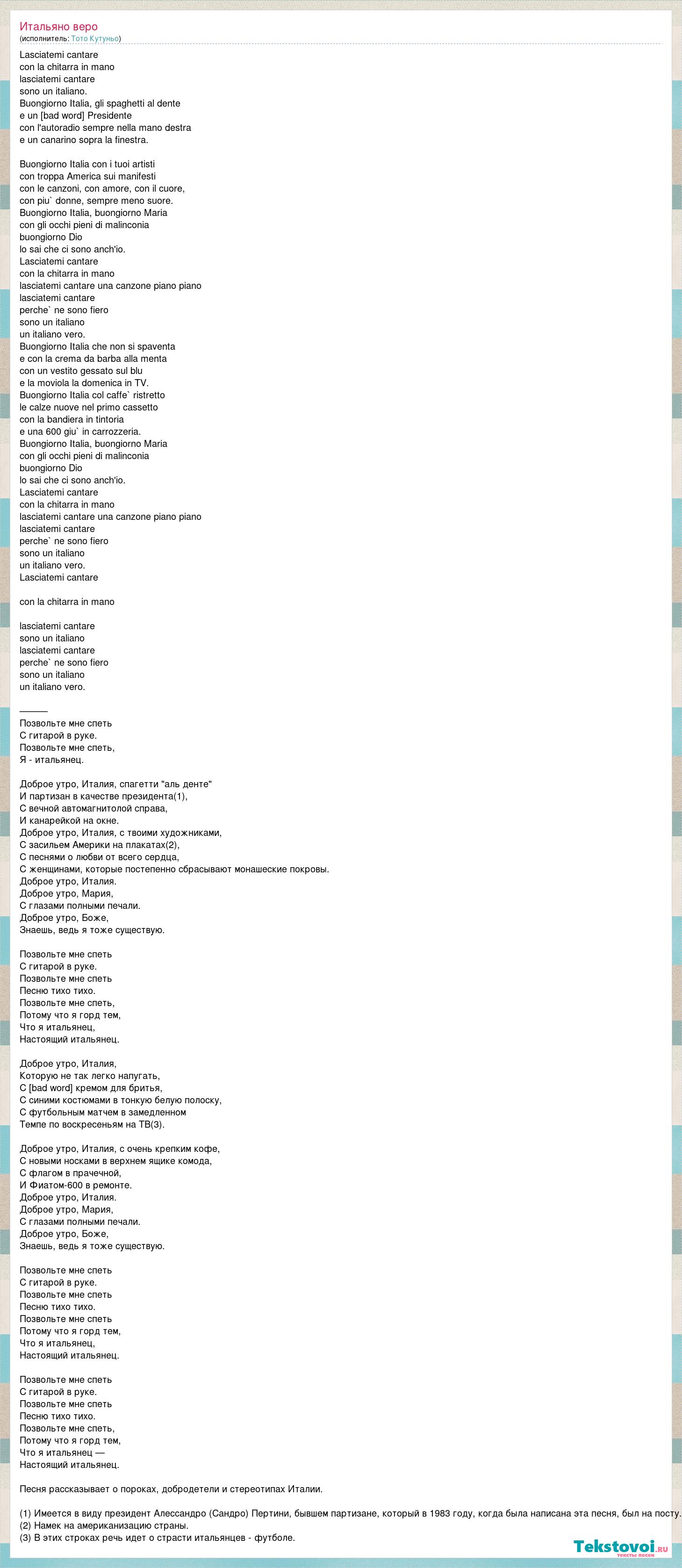 Lasciatemi cantare con la chitarra in mano lasciatemi cantare sono un italiano. Buongiorno Italia, gli spaghetti al dente e un partigiano come Presidente con l'autoradio sempre nella mano destra e un canarino sopra la finestra. Buongiorno Italia con i tuoi artisti con troppa America sui manifesti con le canzoni, con amore, con il cuore, con piu` donne, sempre meno suore. Buongiorno Italia, buongiorno Maria con gli occhi pieni di malinconia buongiorno Dio lo sai che ci sono anch'io. Lasciatemi cantare con la chitarra in mano lasciatemi cantare una canzone piano piano lasciatemi cantare perche` ne sono fiero sono un italiano un italiano vero. Buongiorno Italia che non si spaventa e con la crema da barba alla menta con un vestito gessato sul blu e la moviola la domenica in TV. Buongiorno Italia col caffe` ristretto le calze nuove nel primo cassetto con la bandiera in tintoria e una 600 giu` in carrozzeria. Buongiorno Italia, buongiorno Maria con gli occhi pieni di malinconia buongiorno Dio lo sai che ci sono anch'io. Lasciatemi cantare con la chitarra in mano lasciatemi cantare una canzone piano piano lasciatemi cantare perche` ne sono fiero sono un italiano un italiano vero. Lasciatemi cantare con la chitarra in mano lasciatemi cantare sono un italiano lasciatemi cantare perche` ne sono fiero sono un italiano un italiano vero. ——— Позвольте мне спеть С гитарой в руке. Позвольте мне спеть, Я - итальянец. Доброе утро, Италия, спагетти "аль денте" И партизан в качестве президента(1), С вечной автомагнитолой справа, И канарейкой на окне. Доброе утро, Италия, с твоими художниками, С засильем Америки на плакатах(2), С песнями о любви от всего сердца, С женщинами, которые постепенно сбрасывают монашеские покровы. Доброе утро, Италия. Доброе утро, Мария, С глазами полными печали. Доброе утро, Боже, Знаешь, ведь я тоже существую. Позвольте мне спеть С гитарой в руке. Позвольте мне спеть Песню тихо тихо. Позвольте мне спеть, Потому что я горд тем, Что я итальянец, Настоящий итальянец. Доброе утро, Италия, Которую не так легко напугать, С [bad word] кремом для бритья, С синими костюмами в тонкую белую полоску, С футбольным матчем в замедленном Темпе по воскресеньям на ТВ(3). Доброе утро, Италия, с очень крепким кофе, С новыми носками в верхнем ящике комода, С флагом в прачечной, И Фиатом-600 в ремонте. Доброе утро, Италия. Доброе утро, Мария, С глазами полными печали. Доброе утро, Боже, Знаешь, ведь я тоже существую. Позвольте мне спеть С гитарой в руке. Позвольте мне спеть Песню тихо тихо. Позвольте мне спеть Потому что я горд тем, Что я итальянец, Настоящий итальянец. Позвольте мне спеть С гитарой в руке. Позвольте мне спеть Песню тихо тихо. Позвольте мне спеть, Потому что я горд тем, Что я итальянец — Настоящий итальянец. Песня рассказывает о пороках, добродетели и стереотипах Италии. (1) Имеется в виду президент Алессандро (Сандро) Пертини, бывшем партизане, который в 1983 году, когда была написана эта песня, был на посту. (2) Намек на американизацию страны. (3) В этих строках речь идет о страсти итальянцев - футболе.