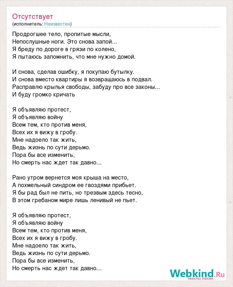 Продрогшее тело, пропитые мысли, Непослушные ноги. Это снова запой... Я бреду по дороге в грязи по колено, Я пытаюсь запомнить, что мне нужно домой. И снова, сделав ошибку, я покупаю бутылку. И снова вместо квартиры я возвращаюсь в подвал. Расправлю крылья свободы, забуду про все законы... И буду громко кричать Я объявляю протест, Я объявляю войну Всем тем, кто против меня, Всех их я вижу в гробу. Мне надоело так жить, Ведь жизнь по сути дерьмо. Пора бы все изменить, Но смерть нас ждет так давно... Рано утром вернется моя крыша на место, А похмельный синдром ее гвоздями прибьет. Я бы рад был не пить, но трезвым здесь тесно, В этом гребаном мире лишь ленивый не пьет. Я объявляю протест, Я объявляю войну Всем тем, кто против меня, Всех их я вижу в гробу. Мне надоело так жить, Ведь жизнь по сути дерьмо. Пора бы все изменить, Но смерть нас ждет так давно...