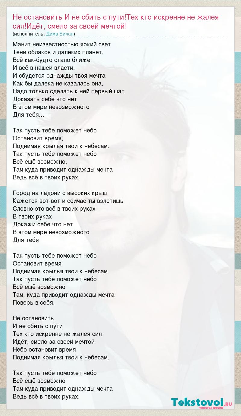 Главная→Исполнители→Дима Билан→Не остановить И не сбить с пути!Тех кто искренне не жалея сил!Идёт, см