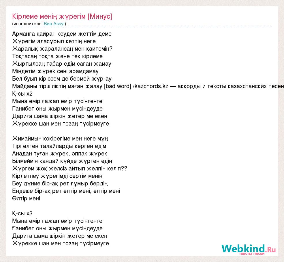 Арманға қайран кеудем жеттім деме Жүрегім аласұрып кеттің неге Жаралық жаралансаң мен қайтемін? Тоқтасаң тоқта және тек кірлеме Жыртылсаң табар едім саған жамау Міндетім жүрек сені арамдамау Бел буып кіріссем де бермей жүр-ау Майданы тіршіліктің маған жалау [bad word] /kazchords.kz — аккорды и тексты казахстанских песен Қ-сы х2 Мына өмір ғажап өмір түсінгенге Ғанибет оны жырмен мүсіндеуде Дариға шама шіркін жетер ме екен Жүрекке шаң мен тозаң түсірмеуге Жимаймын көкірегіме мен неге мұң Тірі өлген талайларды көрген едім Анадан туған жүрек, әппақ жүрек Білмеймін қандай күйде жүрген едің Жүргем жоқ желсіз айтып желпін келіп?? Кірлетпеу жүрегімді сертім менің Беу дүние бір-ақ рет ғұмыр бердің Ендеше бір-ақ рет өлтір мені, өлтір мені Өлтір мені Қ-сы х3 Мына өмір ғажап өмір түсінгенге Ғанибет оны жырмен мүсіндеуде Дариға шама шіркін жетер ме екен Жүрекке шаң мен тозаң түсірмеуге