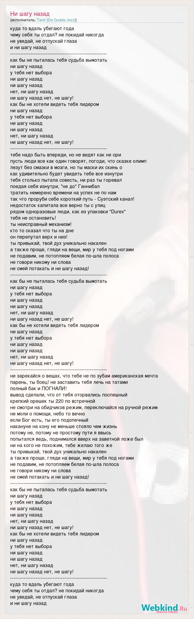 куда то вдаль убегают года чему себя ты отдал? не покидай никогда не уведай, не отпускай глаза и ни шагу назад --------------------------------------------------------- как бы не пыталась тебя судьба вымотать ни шагу назад у тебя нет выбора ни шагу назад ни шагу назад нет, ни шагу назад ни шагу назад нет, не шагу! как бы не хотели видеть тебя лидером ни шагу назад у тебя нет выбора ни шагу назад ни шагу назад нет, ни шагу назад ни шагу назад нет, не шагу! --------------------------------------------------------- тебе надо быть впереди, но не видят как не ори пусть люди все как один говорят, погоди, что сказке олимп лезут без смазки в мозги, но ты маски их скинь о как удивительно будет увидеть тебе все изнутри тебя столько пытала совесть, ни раз ты горевал поедая себя изнутри, "не до" Ганнибал тратить немерено времени на успех не по нам так что проруби себе короткий путь - Суэтский канал! недостаток капитала все верно ты с улиц рядом одноразовые люди, как из упаковки "Durex" тебя не остановить! ты неисправный механизм! кто то сказал что ты на дне он перепутал верх и низ! ты привыкай, твой дух уникально накален а также проще, гляди на вещи, мир у тебя под ногами не подавим, не потопляем белая по-шла полоса не говори никому ни слова не смей потакать и ни шагу назад! --------------------------------------------------------- как бы не пыталась тебя судьба вымотать ни шагу назад у тебя нет выбора ни шагу назад ни шагу назад нет, ни шагу назад ни шагу назад нет, не шагу! как бы не хотели видеть тебя лидером ни шагу назад у тебя нет выбора ни шагу назад ни шагу назад нет, ни шагу назад ни шагу назад нет, не шагу! --------------------------------------------------------- не зарекайся о вещах, что тебе не по зубам американская мечта парень, ты боец! не заставить тебя лечь на татами полный бак и ПОГНАЛИ! вывод сделали, что от тебя оторвались поспешный крепкий орешек ты 220 по встречной не смотри на обидчиков режим, переключайся на ручной режим не моли о помощи, небо то вечно если Бог есть, ты его подопечный накануне на кону не меньше стояло чем жизнь потому не, потому не простому пути я ввысь попытался ведь, поднимался вверх на заветной ложе был ни на кого не похожим, тебе желаю того же ты привыкай, твой дух уникально накален а также проще, гляди на вещи, мир у тебя под ногами не подавим, не потопляем белая по-шла полоса не говори никому ни слова не смей потакать и ни шагу назад! --------------------------------------------------------- как бы не пыталась тебя судьба вымотать ни шагу назад у тебя нет выбора ни шагу назад ни шагу назад нет, ни шагу назад ни шагу назад нет, не шагу! как бы не хотели видеть тебя лидером ни шагу назад у тебя нет выбора ни шагу назад ни шагу назад нет, ни шагу назад ни шагу назад нет, не шагу! --------------------------------------------------------- куда то вдаль убегают года чему себя ты отдал? не покидай никогда не уведай, не отпускай глаза и ни шагу назад