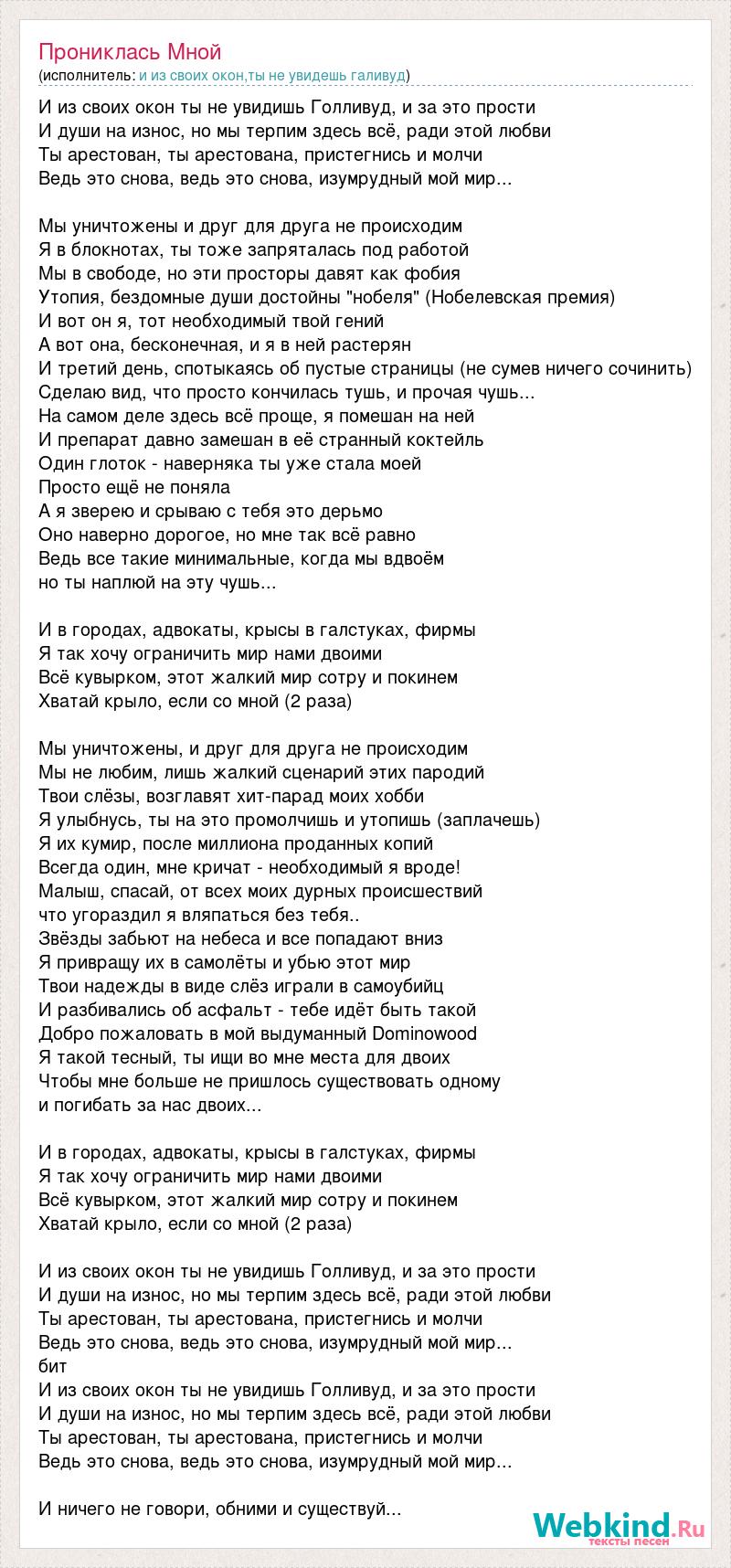 И из своих окон ты не увидишь Голливуд, и за это прости И души на износ, но мы терпим здесь всё, ради этой любви Ты арестован, ты арестована, пристегнись и молчи Ведь это снова, ведь это снова, изумрудный мой мир... Мы уничтожены и друг для друга не происходим Я в блокнотах, ты тоже запряталась под работой Мы в свободе, но эти просторы давят как фобия Утопия, бездомные души достойны "нобеля" (Нобелевская премия) И вот он я, тот необходимый твой гений А вот она, бесконечная, и я в ней растерян И третий день, спотыкаясь об пустые страницы (не сумев ничего сочинить) Сделаю вид, что просто кончилась тушь, и прочая чушь... На самом деле здесь всё проще, я помешан на ней И препарат давно замешан в её странный коктейль Один глоток - наверняка ты уже стала моей Просто ещё не поняла А я зверею и срываю с тебя это дерьмо Оно наверно дорогое, но мне так всё равно Ведь все такие минимальные, когда мы вдвоём но ты наплюй на эту чушь... И в городах, адвокаты, крысы в галстуках, фирмы Я так хочу ограничить мир нами двоими Всё кувырком, этот жалкий мир сотру и покинем Хватай крыло, если со мной (2 раза) Мы уничтожены, и друг для друга не происходим Мы не любим, лишь жалкий сценарий этих пародий Твои слёзы, возглавят хит-парад моих хобби Я улыбнусь, ты на это промолчишь и утопишь (заплачешь) Я их кумир, после миллиона проданных копий Всегда один, мне кричат - необходимый я вроде! Малыш, спасай, от всех моих дурных происшествий что угораздил я вляпаться без тебя.. Звёзды забьют на небеса и все попадают вниз Я привращу их в самолёты и убью этот мир Твои надежды в виде слёз играли в самоубийц И разбивались об асфальт - тебе идёт быть такой Добро пожаловать в мой выдуманный Dominowood Я такой тесный, ты ищи во мне места для двоих Чтобы мне больше не пришлось существовать одному и погибать за нас двоих... И в городах, адвокаты, крысы в галстуках, фирмы Я так хочу ограничить мир нами двоими Всё кувырком, этот жалкий мир сотру и покинем Хватай крыло, если со мной (2 раза) И из своих окон ты не увидишь Голливуд, и за это прости И души на износ, но мы терпим здесь всё, ради этой любви Ты арестован, ты арестована, пристегнись и молчи Ведь это снова, ведь это снова, изумрудный мой мир... бит И из своих окон ты не увидишь Голливуд, и за это прости И души на износ, но мы терпим здесь всё, ради этой любви Ты арестован, ты арестована, пристегнись и молчи Ведь это снова, ведь это снова, изумрудный мой мир... И ничего не говори, обними и существуй...