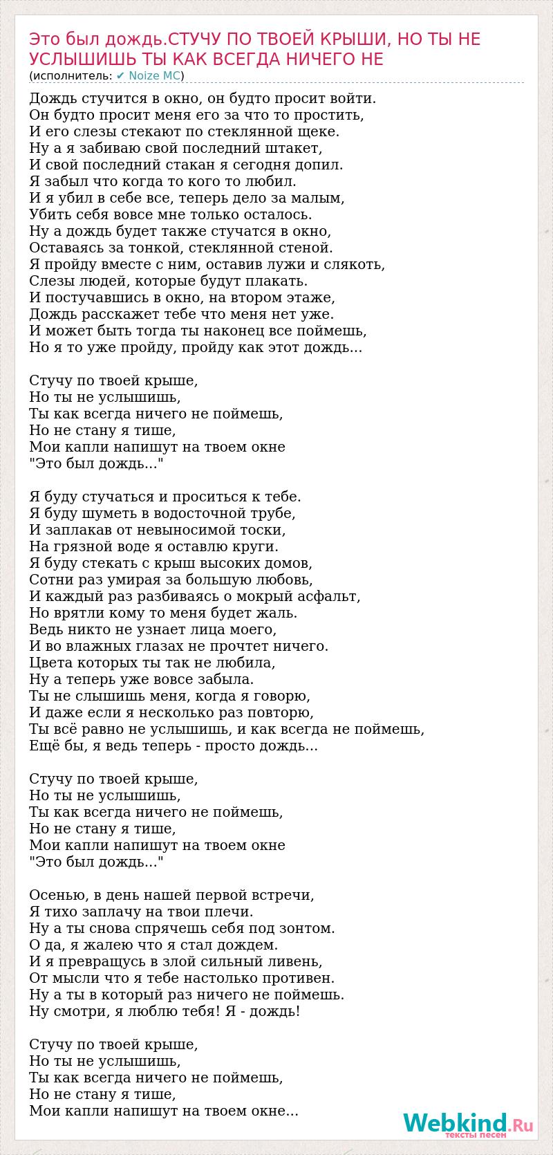 Главная→Исполнители→✔ Noize MC→Это был дождь.СТУЧУ ПО ТВОЕЙ КРЫШИ, НО ТЫ НЕ УСЛЫШИШЬ ТЫ КАК ВСЕГДА НИЧЕГ