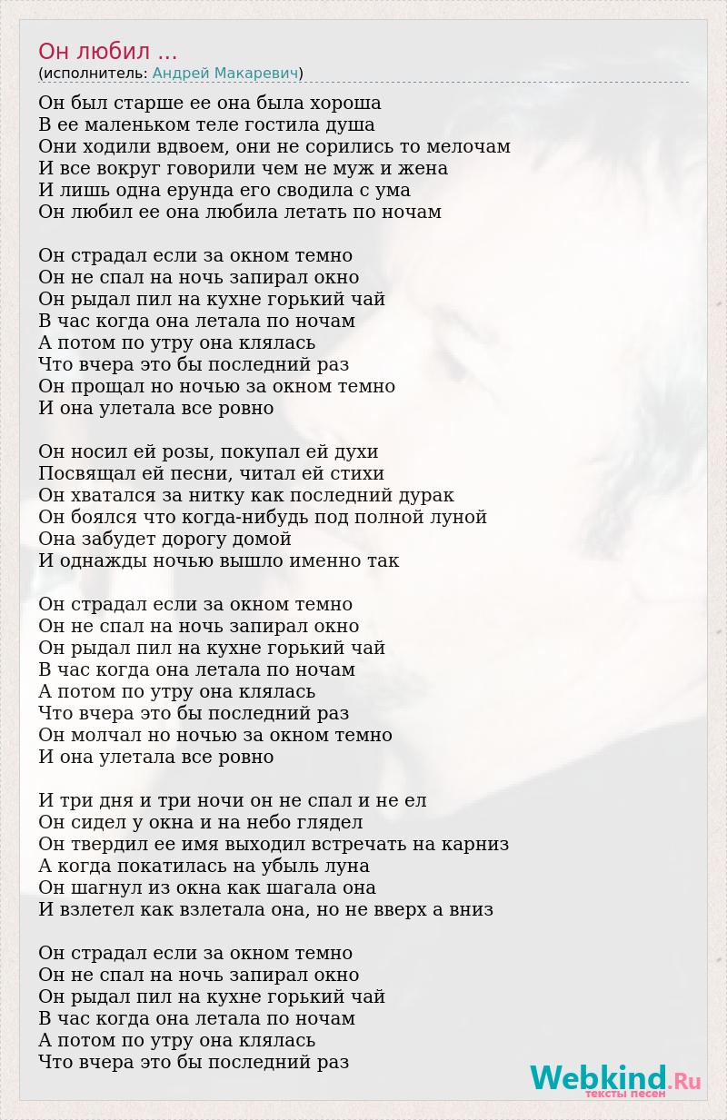 Он был старше ее она была хороша В ее маленьком теле гостила душа Они ходили вдвоем, они не сорились то мелочам И все вокруг говорили чем не муж и жена И лишь одна ерунда его сводила с ума Он любил ее она любила летать по ночам Он страдал если за окном темно Он не спал на ночь запирал окно Он рыдал пил на кухне горький чай В час когда она летала по ночам А потом по утру она клялась Что вчера это бы последний раз Он прощал но ночью за окном темно И она улетала все ровно Он носил ей розы, покупал ей духи Посвящал ей песни, читал ей стихи Он хватался за нитку как последний дурак Он боялся что когда-нибудь под полной луной Она забудет дорогу домой И однажды ночью вышло именно так Он страдал если за окном темно Он не спал на ночь запирал окно Он рыдал пил на кухне горький чай В час когда она летала по ночам А потом по утру она клялась Что вчера это бы последний раз Он молчал но ночью за окном темно И она улетала все ровно И три дня и три ночи он не спал и не ел Он сидел у окна и на небо глядел Он твердил ее имя выходил встречать на карниз А когда покатилась на убыль луна Он шагнул из окна как шагала она И взлетел как взлетала она, но не вверх а вниз Он страдал если за окном темно Он не спал на ночь запирал окно Он рыдал пил на кухне горький чай В час когда она летала по ночам А потом по утру она клялась Что вчера это бы последний раз
