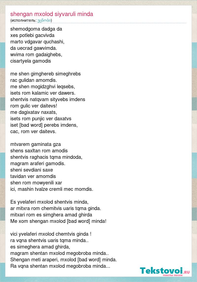 shemodgoma dadga da xes potlebi gacvivda marto vdgavar quchashi, da uecrad gawvimda. wvima rom gadaighebs, cisartyela gamodis me shen gimghereb simeghrebs rac gulidan amomdis. me shen mogidzghvi leqsebs, isets rom kalamic ver dawers. shentvis natqvam sityvebs imdens rom gulic ver daitevs! me dagixatav naxats, isets rom punjic ver daxatvs iset zghaprul perebs imdens, cac, rom ver daitevs. mtvarem gaminata gza shens saxltan rom amodis shentvis raghacis tqma mindoda, magram araferi gamodis. sheni sevdiani saxe tavidan ver amomdis shen rom mowyenili xar ici, mashin tvalze cremli mec momdis. Es yvelaferi mxolod shentvis minda, ar mitxra rom chemitvis uaris tqma ginda. mitxari rom es simghera amad ghirda Me xom shengan mxolod siyvaruli minda! vici yvelaferi mxolod chemtvis ginda ! ra vqna shentvis uaris tqma minda.. es simeghera amad ghirda, magram shentan mxolod megobroba minda.. Shengan meti araperi, mxolod siyvaruli minda. Ra vqna shentan mxolod megobroba minda...