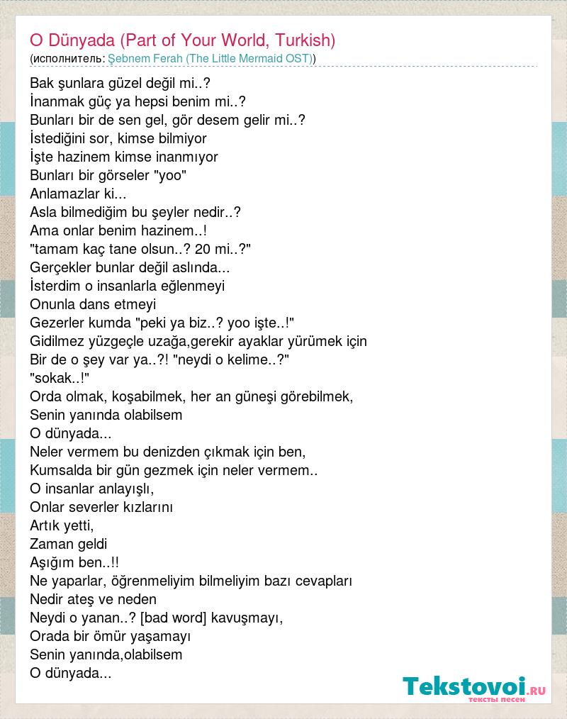 А как ты думаешь, о чем песня "O Dünyada (Part of Your World, Turkish)" ?