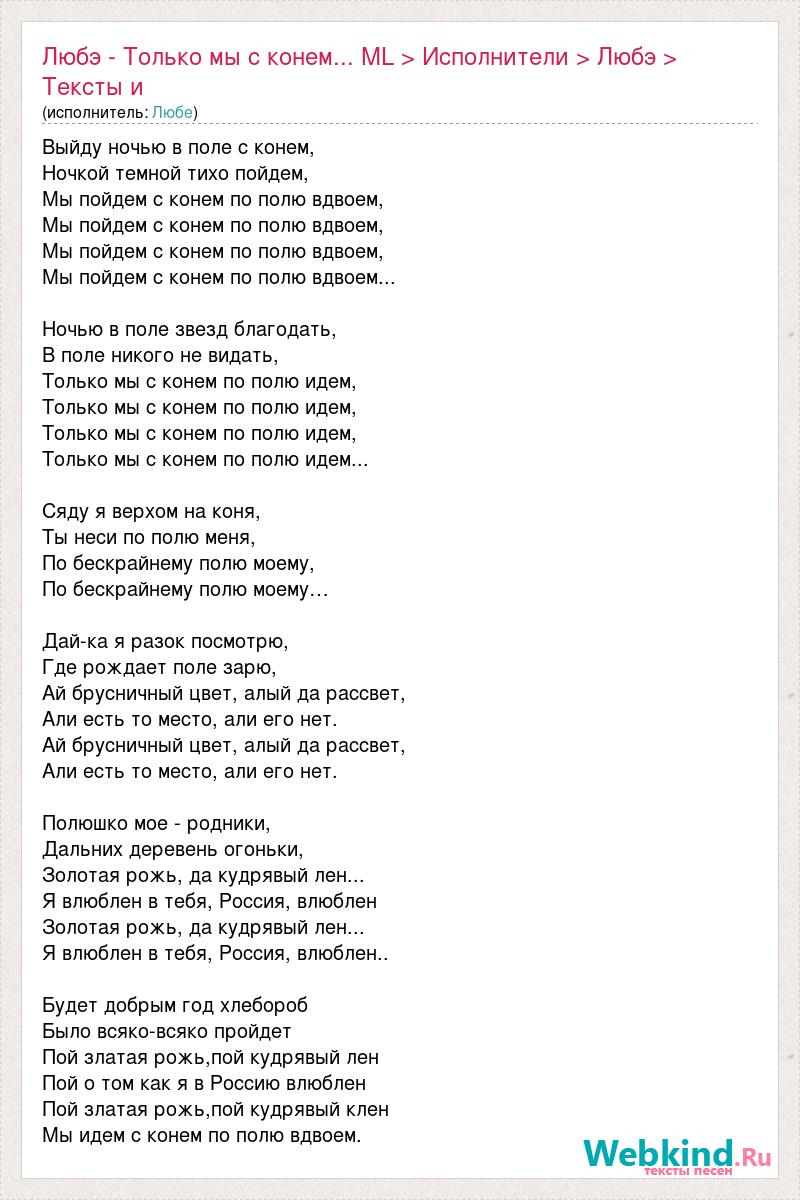 Выйду ночью в поле с конем, Ночкой темной тихо пойдем, Мы пойдем с конем по полю вдвоем, Мы пойдем с конем по полю вдвоем, Мы пойдем с конем по полю вдвоем, Мы пойдем с конем по полю вдвоем... Ночью в поле звезд благодать, В поле никого не видать, Только мы с конем по полю идем, Только мы с конем по полю идем, Только мы с конем по полю идем, Только мы с конем по полю идем... Сяду я верхом на коня, Ты неси по полю меня, По бескрайнему полю моему, По бескрайнему полю моему… Дай-ка я разок посмотрю, Где рождает поле зарю, Ай брусничный цвет, алый да рассвет, Али есть то место, али его нет. Ай брусничный цвет, алый да рассвет, Али есть то место, али его нет. Полюшко мое - родники, Дальних деревень огоньки, Золотая рожь, да кудрявый лен... Я влюблен в тебя, Россия, влюблен Золотая рожь, да кудрявый лен... Я влюблен в тебя, Россия, влюблен.. Будет добрым год хлебороб Было всяко-всяко пройдет Пой златая рожь,пой кудрявый лен Пой о том как я в Россию влюблен Пой златая рожь,пой кудрявый клен Мы идем с конем по полю вдвоем.