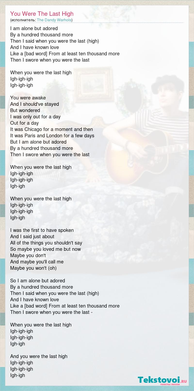 I am alone but adored By a hundred thousand more Then I said when you were the last (high) And I have known love Like a [bad word] From at least ten thousand more Then I swore when you were the last When you were the last high Igh-igh-igh Igh-igh-igh You were awake And I should've stayed But wondered I was only out for a day Out for a day It was Chicago for a moment and then It was Paris and London for a few days But I am alone but adored By a hundred thousand more Then I swore when you were the last When you were the last high Igh-igh-igh Igh-igh-igh Igh-igh When you were the last high Igh-igh-igh Igh-igh-igh Igh-igh I was the first to have spoken And I said just about All of the things you shouldn't say So maybe you loved me but now Maybe you don't And maybe you'll call me Maybe you won't (oh) So I am alone but adored By a hundred thousand more Then I said when you were the last (high) And I have known love Like a [bad word] From at least ten thousand more Then I swore when you were the last - When you were the last high Igh-igh-igh Igh-igh-igh Igh-igh And you were the last high Igh-igh-igh Igh-igh-igh Igh-igh
