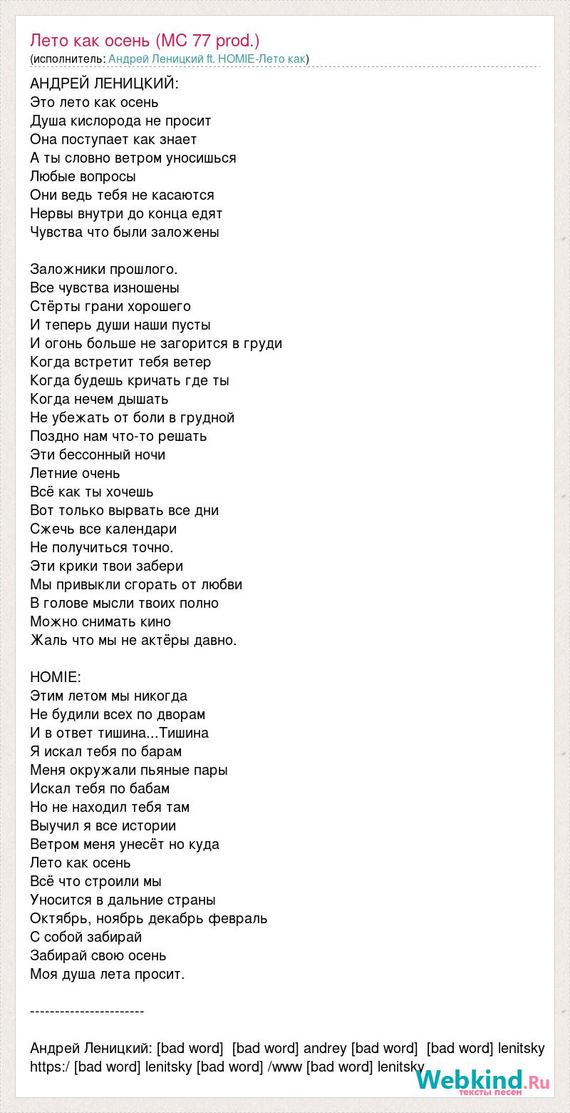 АНДРЕЙ ЛЕНИЦКИЙ: Это лето как осень Душа кислорода не просит Она поступает как знает А ты словно ветром уносишься Любые вопросы Они ведь тебя не касаются Нервы внутри до конца едят Чувства что были заложены Заложники прошлого. Все чувства изношены Стёрты грани хорошего И теперь души наши пусты И огонь больше не загорится в груди Когда встретит тебя ветер Когда будешь кричать где ты Когда нечем дышать Не убежать от боли в грудной Поздно нам что-то решать Эти бессонный ночи Летние очень Всё как ты хочешь Вот только вырвать все дни Сжечь все календари Не получиться точно. Эти крики твои забери Мы привыкли сгорать от любви В голове мысли твоих полно Можно снимать кино Жаль что мы не актёры давно. HOMIE: Этим летом мы никогда Не будили всех по дворам И в ответ тишина...Тишина Я искал тебя по барам Меня окружали пьяные пары Искал тебя по бабам Но не находил тебя там Выучил я все истории Ветром меня унесёт но куда Лето как осень Всё что строили мы Уносится в дальние страны Октябрь, ноябрь декабрь февраль С собой забирай Забирай свою осень Моя душа лета просит. ----------------------- Андрей Леницкий: [bad word] [bad word] andrey [bad word] [bad word] lenitsky https:/ [bad word] lenitsky [bad word] /www [bad word] lenitsky