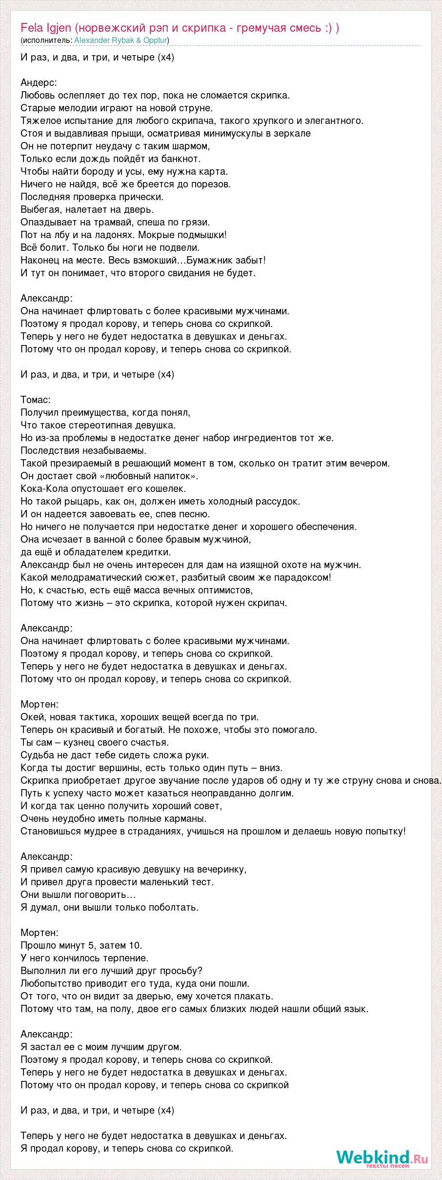 И раз, и два, и три, и четыре (х4) Андерс: Любовь ослепляет до тех пор, пока не сломается скрипка. Старые мелодии играют на новой струне. Тяжелое испытание для любого скрипача, такого хрупкого и элегантного. Стоя и выдавливая прыщи, осматривая минимускулы в зеркале Он не потерпит неудачу с таким шармом, Только если дождь пойдёт из банкнот. Чтобы найти бороду и усы, ему нужна карта. Ничего не найдя, всё же бреется до порезов. Последняя проверка прически. Выбегая, налетает на дверь. Опаздывает на трамвай, спеша по грязи. Пот на лбу и на ладонях. Мокрые подмышки! Всё болит. Только бы ноги не подвели. Наконец на месте. Весь взмокший…Бумажник забыт! И тут он понимает, что второго свидания не будет. Александр: Она начинает флиртовать с более красивыми мужчинами. Поэтому я продал корову, и теперь снова со скрипкой. Теперь у него не будет недостатка в девушках и деньгах. Потому что он продал корову, и теперь снова со скрипкой. И раз, и два, и три, и четыре (х4) Томас: Получил преимущества, когда понял, Что такое стереотипная девушка. Но из-за проблемы в недостатке денег набор ингредиентов тот же. Последствия незабываемы. Такой презираемый в решающий момент в том, сколько он тратит этим вечером. Он достает свой «любовный напиток». Кока-Кола опустошает его кошелек. Но такой рыцарь, как он, должен иметь холодный рассудок. И он надеется завоевать ее, спев песню. Но ничего не получается при недостатке денег и хорошего обеспечения. Она исчезает в ванной с более бравым мужчиной, да ещё и обладателем кредитки. Александр был не очень интересен для дам на изящной охоте на мужчин. Какой мелодраматический сюжет, разбитый своим же парадоксом! Но, к счастью, есть ещё масса вечных оптимистов, Потому что жизнь – это скрипка, которой нужен скрипач. Александр: Она начинает флиртовать с более красивыми мужчинами. Поэтому я продал корову, и теперь снова со скрипкой. Теперь у него не будет недостатка в девушках и деньгах. Потому что он продал корову, и теперь снова со скрипкой. Мортен: Окей, новая тактика, хороших вещей всегда по три. Теперь он красивый и богатый. Не похоже, чтобы это помогало. Ты сам – кузнец своего счастья. Судьба не даст тебе сидеть сложа руки. Когда ты достиг вершины, есть только один путь – вниз. Скрипка приобретает другое звучание после ударов об одну и ту же струну снова и снова. Путь к успеху часто может казаться неоправданно долгим. И когда так ценно получить хороший совет, Очень неудобно иметь полные карманы. Становишься мудрее в страданиях, учишься на прошлом и делаешь новую попытку! Александр: Я привел самую красивую девушку на вечеринку, И привел друга провести маленький тест. Они вышли поговорить… Я думал, они вышли только поболтать. Мортен: Прошло минут 5, затем 10. У него кончилось терпение. Выполнил ли его лучший друг просьбу? Любопытство приводит его туда, куда они пошли. От того, что он видит за дверью, ему хочется плакать. Потому что там, на полу, двое его самых близких людей нашли общий язык. Александр: Я застал ее с моим лучшим другом. Поэтому я продал корову, и теперь снова со скрипкой. Теперь у него не будет недостатка в девушках и деньгах. Потому что он продал корову, и теперь снова со скрипкой И раз, и два, и три, и четыре (х4) Теперь у него не будет недостатка в девушках и деньгах. Я продал корову, и теперь снова со скрипкой.