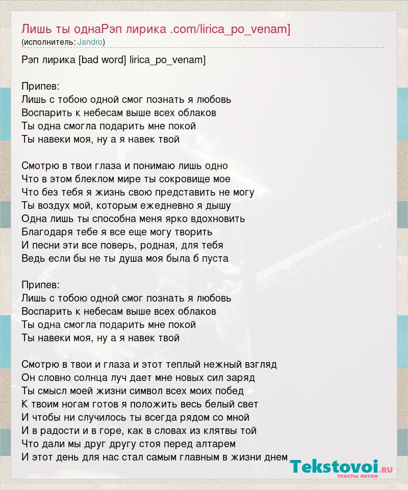 Рэп лирика [bad word] lirica_po_venam] Припев: Лишь с тобою одной смог познать я любовь Воспарить к небесам выше всех облаков Ты одна смогла подарить мне покой Ты навеки моя, ну а я навек твой Смотрю в твои глаза и понимаю лишь одно Что в этом блеклом мире ты сокровище мое Что без тебя я жизнь свою представить не могу Ты воздух мой, которым ежедневно я дышу Одна лишь ты способна меня ярко вдохновить Благодаря тебе я все еще могу творить И песни эти все поверь, родная, для тебя Ведь если бы не ты душа моя была б пуста Припев: Лишь с тобою одной смог познать я любовь Воспарить к небесам выше всех облаков Ты одна смогла подарить мне покой Ты навеки моя, ну а я навек твой Смотрю в твои и глаза и этот теплый нежный взгляд Он словно солнца луч дает мне новых сил заряд Ты смысл моей жизни символ всех моих побед К твоим ногам готов я положить весь белый свет И чтобы ни случилось ты всегда рядом со мной И в радости и в горе, как в словах из клятвы той Что дали мы друг другу стоя перед алтарем И этот день для нас стал самым главным в жизни днем