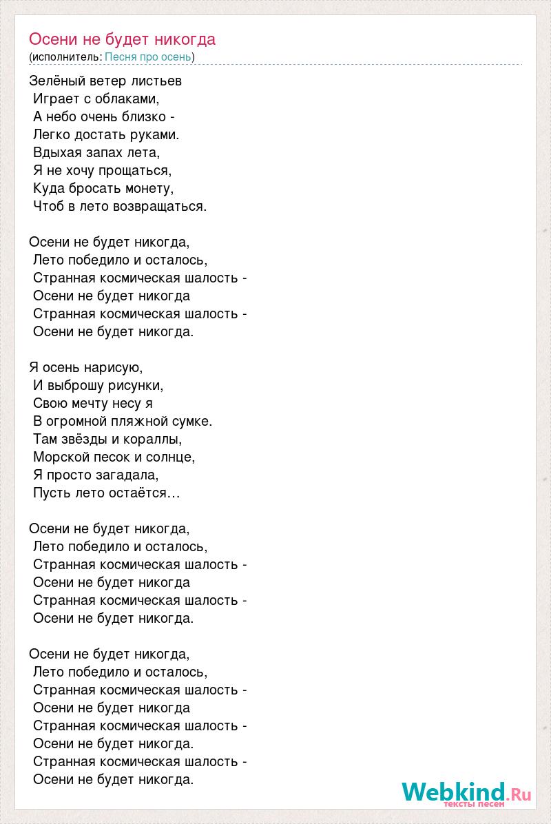 Зелёный ветер листьев Играет с облаками, А небо очень близко - Легко достать руками. Вдыхая запах лета, Я не хочу прощаться, Куда бросать монету, Чтоб в лето возвращаться. Осени не будет никогда, Лето победило и осталось, Странная космическая шалость - Осени не будет никогда Странная космическая шалость - Осени не будет никогда. Я осень нарисую, И выброшу рисунки, Свою мечту несу я В огромной пляжной сумке. Там звёзды и кораллы, Морской песок и солнце, Я просто загадала, Пусть лето остаётся… Осени не будет никогда, Лето победило и осталось, Странная космическая шалость - Осени не будет никогда Странная космическая шалость - Осени не будет никогда. Осени не будет никогда, Лето победило и осталось, Странная космическая шалость - Осени не будет никогда Странная космическая шалость - Осени не будет никогда. Странная космическая шалость - Осени не будет никогда.