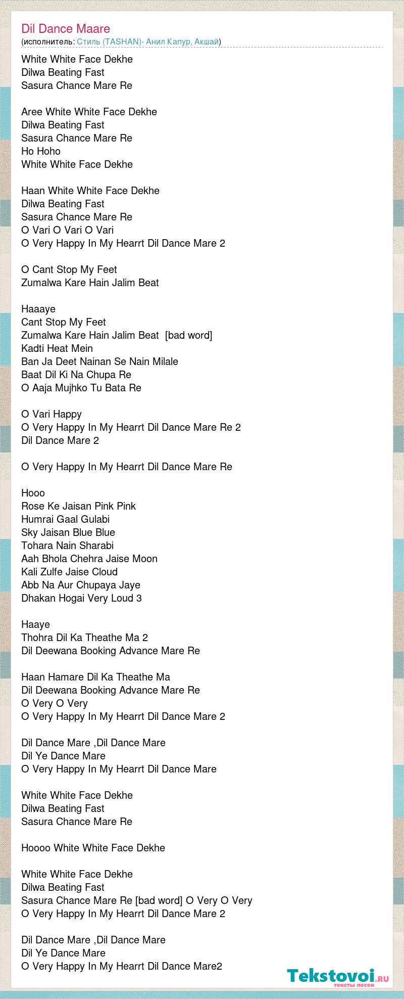 White White Face Dekhe Dilwa Beating Fast Sasura Chance Mare Re Aree White White Face Dekhe Dilwa Beating Fast Sasura Chance Mare Re Ho Hoho White White Face Dekhe Haan White White Face Dekhe Dilwa Beating Fast Sasura Chance Mare Re O Vari O Vari O Vari O Very Happy In My Hearrt Dil Dance Mare 2 O Cant Stop My Feet Zumalwa Kare Hain Jalim Beat Haaaye Cant Stop My Feet Zumalwa Kare Hain Jalim Beat [bad word] Kadti Heat Mein Ban Ja Deet Nainan Se Nain Milale Baat Dil Ki Na Chupa Re O Aaja Mujhko Tu Bata Re O Vari Happy O Very Happy In My Hearrt Dil Dance Mare Re 2 Dil Dance Mare 2 O Very Happy In My Hearrt Dil Dance Mare Re Hooo Rose Ke Jaisan Pink Pink Humrai Gaal Gulabi Sky Jaisan Blue Blue Tohara Nain Sharabi Aah Bhola Chehra Jaise Moon Kali Zulfe Jaise Cloud Abb Na Aur Chupaya Jaye Dhakan Hogai Very Loud 3 Haaye Thohra Dil Ka Theathe Ma 2 Dil Deewana Booking Advance Mare Re Haan Hamare Dil Ka Theathe Ma Dil Deewana Booking Advance Mare Re O Very O Very O Very Happy In My Hearrt Dil Dance Mare 2 Dil Dance Mare ,Dil Dance Mare Dil Ye Dance Mare O Very Happy In My Hearrt Dil Dance Mare White White Face Dekhe Dilwa Beating Fast Sasura Chance Mare Re Hoooo White White Face Dekhe White White Face Dekhe Dilwa Beating Fast Sasura Chance Mare Re [bad word] O Very O Very O Very Happy In My Hearrt Dil Dance Mare 2 Dil Dance Mare ,Dil Dance Mare Dil Ye Dance Mare O Very Happy In My Hearrt Dil Dance Mare2