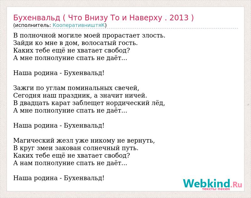 В полночной могиле моей прорастает злость. Зайди ко мне в дом, волосатый гость. Каких тебе ещё не хватает свобод? А мне полнолуние спать не даёт... Наша родина - Бухенвальд! Зажги по углам поминальных свечей, Сегодня наш праздник, а значит ничей. В двадцать карат заблещет нордический лёд, А мне полнолуние спать не даёт... Наша родина - Бухенвальд! Магический жезл уже никому не вернуть, В круг змеи закован солнечный путь. Каких тебе ещё не хватает свобод? А нам полнолуние спать не даёт... Наша родина - Бухенвальд!