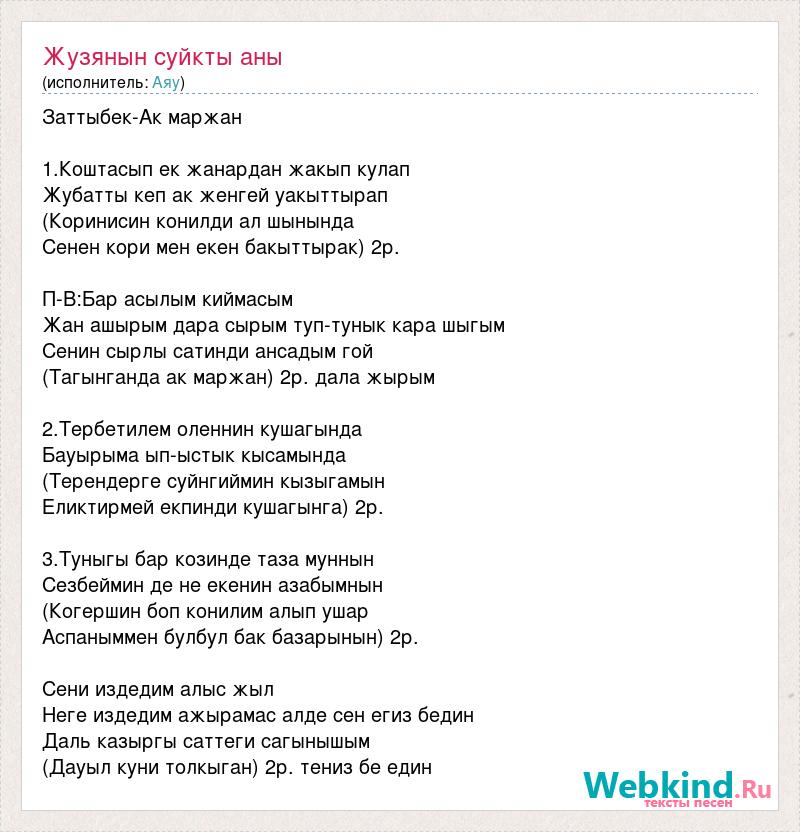 Заттыбек-Ак маржан 1.Коштасып ек жанардан жакып кулап Жубатты кеп ак женгей уакыттырап (Коринисин конилди ал шынында Сенен кори мен екен бакыттырак) 2р. П-В:Бар асылым киймасым Жан ашырым дара сырым туп-тунык кара шыгым Сенин сырлы сатинди ансадым гой (Тагынганда ак маржан) 2р. дала жырым 2.Тербетилем оленнин кушагында Бауырыма ып-ыстык кысамында (Терендерге суйнгиймин кызыгамын Еликтирмей екпинди кушагынга) 2р. 3.Туныгы бар козинде таза муннын Сезбеймин де не екенин азабымнын (Когершин боп конилим алып ушар Аспаныммен булбул бак базарынын) 2р. Сени издедим алыс жыл Неге издедим ажырамас алде сен егиз бедин Даль казыргы саттеги сагынышым (Дауыл куни толкыган) 2р. тениз бе един
