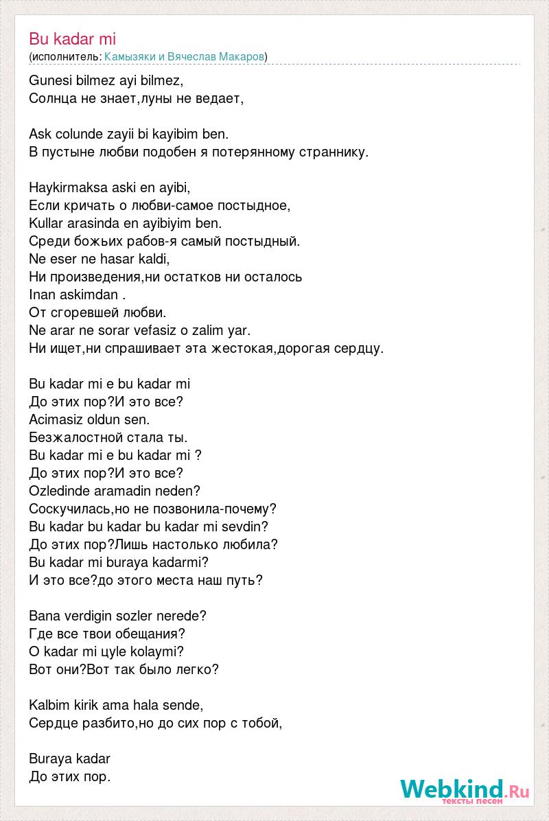 Gunesi bilmez ayi bilmez, Солнца не знает,луны не ведает, Ask colunde zayii bi kayibim ben. В пустыне любви подобен я потерянному страннику. Haykirmaksa aski en ayibi, Если кричать о любви-самое постыдное, Kullar arasinda en ayibiyim ben. Среди божьих рабов-я самый постыдный. Ne eser ne hasar kaldi, Ни произведения,ни остатков ни осталось Inan askimdan . От сгоревшей любви. Ne arar ne sorar vefasiz o zalim yar. Ни ищет,ни спрашивает эта жестокая,дорогая сердцу. Bu kadar mi e bu kadar mi До этих пор?И это все? Acimasiz oldun sen. Безжалостной стала ты. Bu kadar mi e bu kadar mi ? До этих пор?И это все? Ozledinde aramadin neden? Соскучилась,но не позвонила-почему? Bu kadar bu kadar bu kadar mi sevdin? До этих пор?Лишь настолько любила? Bu kadar mi buraya kadarmi? И это все?до этого места наш путь? Bana verdigin sozler nerede? Где все твои обещания? O kadar mi цyle kolaymi? Вот они?Вот так было легко? Kalbim kirik ama hala sende, Сердце разбито,но до сих пор с тобой, Buraya kadar До этих пор.