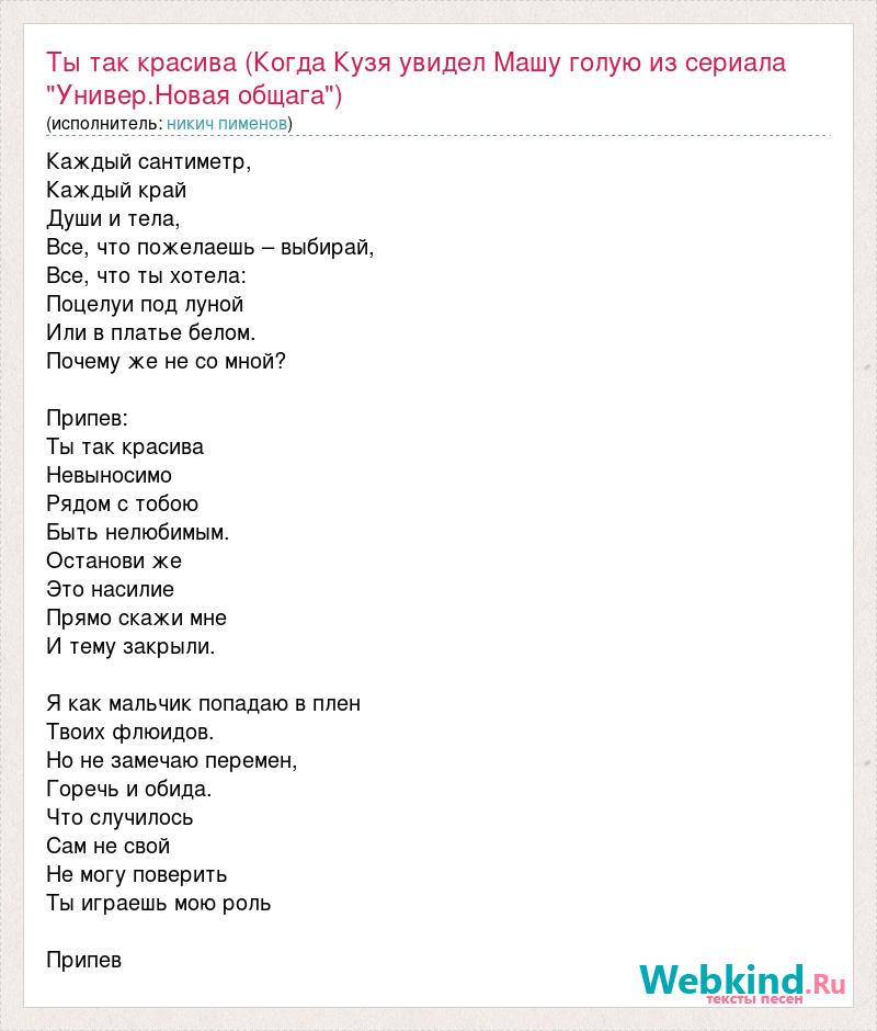 Главная→Исполнители→Никич пименов→Ты так красива (Когда Кузя увидел Машу голую из сериала "Универ.Новая общага")