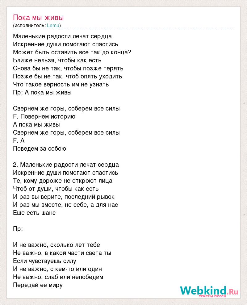 Маленькие радости лечат сердца Искренние души помогают спастись Может быть оставить все так до конца? Ближе нельзя, чтобы как есть Снова бы не так, чтобы позже терять Позже бы не так, чтоб опять уходить Что такое верность им не узнать Пр: А пока мы живы Свернем же горы, соберем все силы F. Повернем историю А пока мы живы Свернем же горы, соберем все силы F. А Поведем за собою 2. Маленькие радости лечат сердца Искренние души помогают спастись Те, кому дороже не откроют лица Чтоб от души, чтобы как есть И раз вы верите, последний рывок И раз мы вместе, не себе, а для нас Еще есть шанс Пр: И не важно, сколько лет тебе Не важно, в какой части света ты Если чувствуешь силу И не важно, с кем-то или один Не важно, слаб или непобедим Передай ее миру