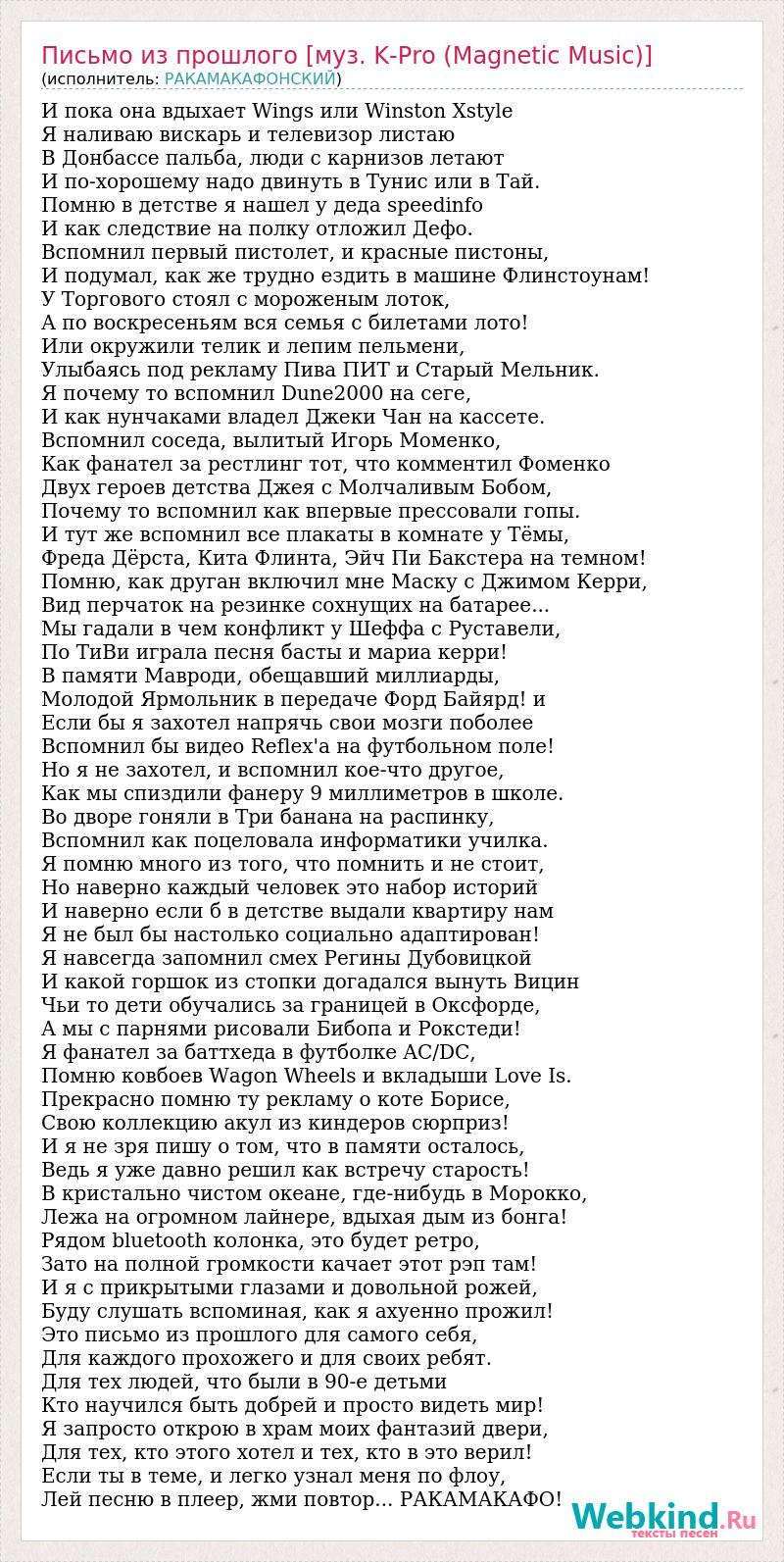 И пока она вдыхает Wings или Winston Xstyle Я наливаю вискарь и телевизор листаю В Донбассе пальба, люди с карнизов летают И по-хорошему надо двинуть в Тунис или в Тай. Помню в детстве я нашел у деда speedinfo И как следствие на полку отложил Дефо. Вспомнил первый пистолет, и красные пистоны, И подумал, как же трудно ездить в машине Флинстоунам! У Торгового стоял с мороженым лоток, А по воскресеньям вся семья с билетами лото! Или окружили телик и лепим пельмени, Улыбаясь под рекламу Пива ПИТ и Старый Мельник. Я почему то вспомнил Dune2000 на сеге, И как нунчаками владел Джеки Чан на кассете. Вспомнил соседа, вылитый Игорь Моменко, Как фанател за рестлинг тот, что комментил Фоменко Двух героев детства Джея с Молчаливым Бобом, Почему то вспомнил как впервые прессовали гопы. И тут же вспомнил все плакаты в комнате у Тёмы, Фреда Дёрста, Кита Флинта, Эйч Пи Бакстера на темном! Помню, как друган включил мне Маску с Джимом Керри, Вид перчаток на резинке сохнущих на батарее... Мы гадали в чем конфликт у Шеффа с Руставели, По ТиВи играла песня басты и мариа керри! В памяти Мавроди, обещавший миллиарды, Молодой Ярмольник в передаче Форд Байярд! и Если бы я захотел напрячь свои мозги поболее Вспомнил бы видео Reflex'а на футбольном поле! Но я не захотел, и вспомнил кое-что другое, Как мы спиздили фанеру 9 миллиметров в школе. Во дворе гоняли в Три банана на распинку, Вспомнил как поцеловала информатики училка. Я помню много из того, что помнить и не стоит, Но наверно каждый человек это набор историй И наверно если б в детстве выдали квартиру нам Я не был бы настолько социально адаптирован! Я навсегда запомнил смех Регины Дубовицкой И какой горшок из стопки догадался вынуть Вицин Чьи то дети обучались за границей в Оксфорде, А мы с парнями рисовали Бибопа и Рокстеди! Я фанател за баттхеда в футболке AC/DC, Помню ковбоев Wagon Wheels и вкладыши Love Is. Прекрасно помню ту рекламу о коте Борисе, Свою коллекцию акул из киндеров сюрприз! И я не зря пишу о том, что в памяти осталось, Ведь я уже давно решил как встречу старость! В кристально чистом океане, где-нибудь в Морокко, Лежа на огромном лайнере, вдыхая дым из бонга! Рядом bluetooth колонка, это будет ретро, Зато на полной громкости качает этот рэп там! И я с прикрытыми глазами и довольной рожей, Буду слушать вспоминая, как я ахуенно прожил! Это письмо из прошлого для самого себя, Для каждого прохожего и для своих ребят. Для тех людей, что были в 90-е детьми Кто научился быть добрей и просто видеть мир! Я запросто открою в храм моих фантазий двери, Для тех, кто этого хотел и тех, кто в это верил! Если ты в теме, и легко узнал меня по флоу, Лей песню в плеер, жми повтор... РАКАМАКАФО!