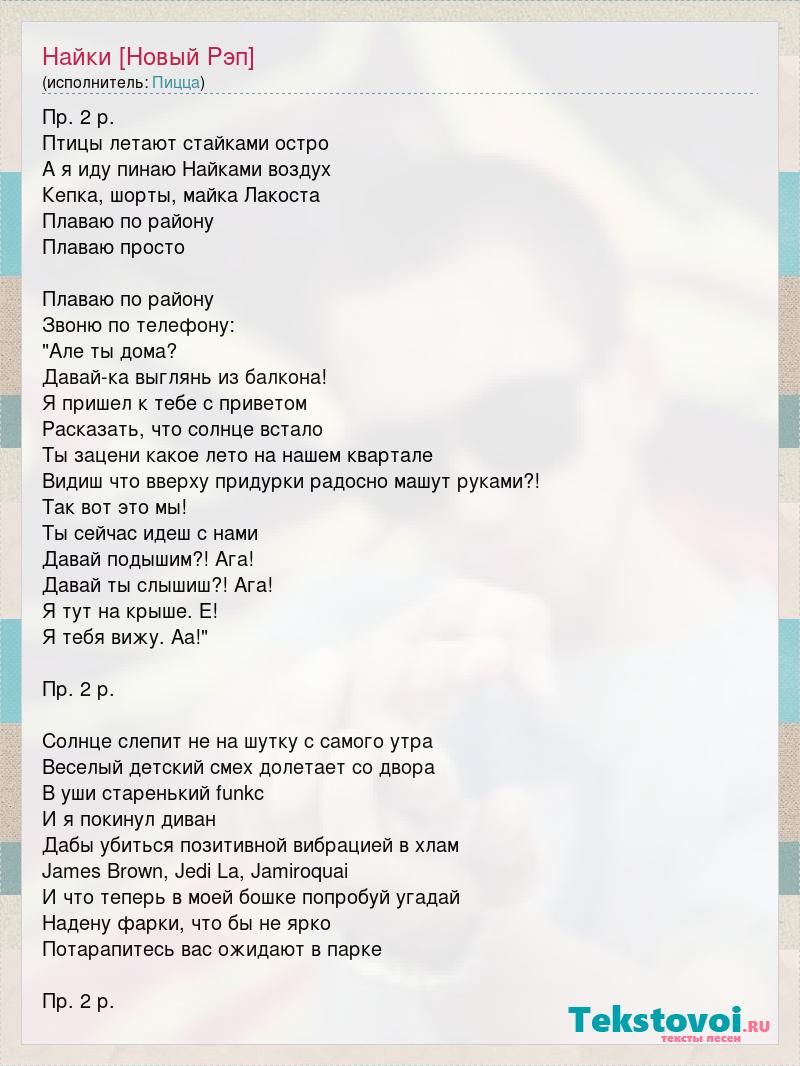 Пр. 2 р. Птицы летают стайками остро А я иду пинаю Найками воздух Кепка, шорты, майка Лакоста Плаваю по району Плаваю просто Плаваю по району Звоню по телефону: "Але ты дома? Давай-ка выглянь из балкона! Я пришел к тебе с приветом Расказать, что солнце встало Ты зацени какое лето на нашем квартале Видиш что вверху придурки радосно машут руками?! Так вот это мы! Ты сейчас идеш с нами Давай подышим?! Ага! Давай ты слышиш?! Ага! Я тут на крыше. Е! Я тебя вижу. Аа!" Пр. 2 р. Солнце слепит не на шутку с самого утра Веселый детский смех долетает со двора В уши старенький funkc И я покинул диван Дабы убиться позитивной вибрацией в хлам James Brown, Jedi La, Jamiroquai И что теперь в моей бошке попробуй угадай Надену фарки, что бы не ярко Потарапитесь вас ожидают в парке Пр. 2 р.