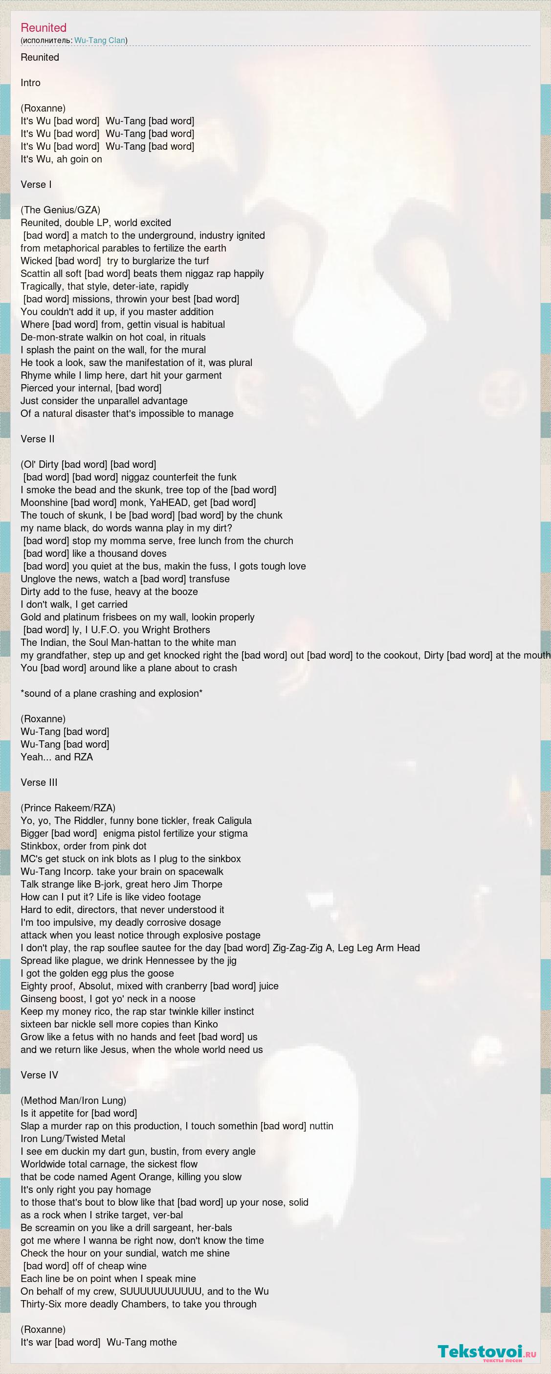 Reunited Intro (Roxanne) It's Wu [bad word] Wu-Tang [bad word] It's Wu [bad word] Wu-Tang [bad word] It's Wu [bad word] Wu-Tang [bad word] It's Wu, ah goin on Verse I (The Genius/GZA) Reunited, double LP, world excited [bad word] a match to the underground, industry ignited from metaphorical parables to fertilize the earth Wicked [bad word] try to burglarize the turf Scattin all soft [bad word] beats them niggaz rap happily Tragically, that style, deter-iate, rapidly [bad word] missions, throwin your best [bad word] You couldn't add it up, if you master addition Where [bad word] from, gettin visual is habitual De-mon-strate walkin on hot coal, in rituals I splash the paint on the wall, for the mural He took a look, saw the manifestation of it, was plural Rhyme while I limp here, dart hit your garment Pierced your internal, [bad word] Just consider the unparallel advantage Of a natural disaster that's impossible to manage Verse II (Ol' Dirty [bad word] [bad word] [bad word] [bad word] niggaz counterfeit the funk I smoke the bead and the skunk, tree top of the [bad word] Moonshine [bad word] monk, YaHEAD, get [bad word] The touch of skunk, I be [bad word] [bad word] by the chunk my name black, do words wanna play in my dirt? [bad word] stop my momma serve, free lunch from the church [bad word] like a thousand doves [bad word] you quiet at the bus, makin the fuss, I gots tough love Unglove the news, watch a [bad word] transfuse Dirty add to the fuse, heavy at the booze I don't walk, I get carried Gold and platinum frisbees on my wall, lookin properly [bad word] ly, I U.F.O. you Wright Brothers The Indian, the Soul Man-hattan to the white man my grandfather, step up and get knocked right the [bad word] out [bad word] to the cookout, Dirty [bad word] at the mouth You [bad word] around like a plane about to crash *sound of a plane crashing and explosion* (Roxanne) Wu-Tang [bad word] Wu-Tang [bad word] Yeah... and RZA Verse III (Prince Rakeem/RZA) Yo, yo, The Riddler, funny bone tickler, freak Caligula Bigger [bad word] enigma pistol fertilize your stigma Stinkbox, order from pink dot MC's get stuck on ink blots as I plug to the sinkbox Wu-Tang Incorp. take your brain on spacewalk Talk strange like B-jork, great hero Jim Thorpe How can I put it? Life is like video footage Hard to edit, directors, that never understood it I'm too impulsive, my deadly corrosive dosage attack when you least notice through explosive postage I don't play, the rap souflee sautee for the day [bad word] Zig-Zag-Zig A, Leg Leg Arm Head Spread like plague, we drink Hennessee by the jig I got the golden egg plus the goose Eighty proof, Absolut, mixed with cranberry [bad word] juice Ginseng boost, I got yo' neck in a noose Keep my money rico, the rap star twinkle killer instinct sixteen bar nickle sell more copies than Kinko Grow like a fetus with no hands and feet [bad word] us and we return like Jesus, when the whole world need us Verse IV (Method Man/Iron Lung) Is it appetite for [bad word] Slap a murder rap on this production, I touch somethin [bad word] nuttin Iron Lung/Twisted Metal I see em duckin my dart gun, bustin, from every angle Worldwide total carnage, the sickest flow that be code named Agent Orange, killing you slow It's only right you pay homage to those that's bout to blow like that [bad word] up your nose, solid as a rock when I strike target, ver-bal Be screamin on you like a drill sargeant, her-bals got me where I wanna be right now, don't know the time Check the hour on your sundial, watch me shine [bad word] off of cheap wine Each line be on point when I speak mine On behalf of my crew, SUUUUUUUUUUU, and to the Wu Thirty-Six more deadly Chambers, to take you through (Roxanne) It's war [bad word] Wu-Tang mothe