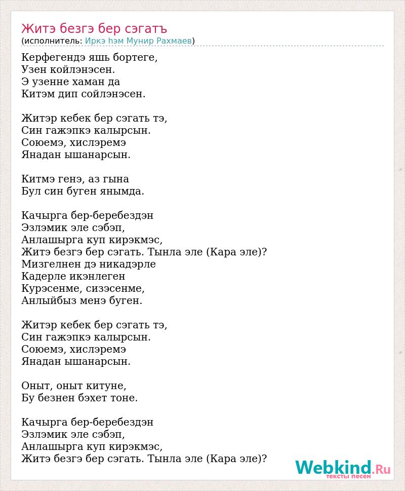 Керфегендэ яшь бортеге, Узен койлэнэсен. Э узенне хаман да Китэм дип сойлэнэсен. Житэр кебек бер сэгать тэ, Син гажэпкэ калырсын. Союемэ, хислэремэ Янадан ышанарсын. Китмэ генэ, аз гына Бул син буген янымда. Качырга бер-беребездэн Эзлэмик эле сэбэп, Анлашырга куп кирэкмэс, Житэ безгэ бер сэгать. Тынла эле (Кара эле)? Мизгелнен дэ никадэрле Кадерле икэнлеген Курэсенме, сизэсенме, Анлыйбыз менэ буген. Житэр кебек бер сэгать тэ, Син гажэпкэ калырсын. Союемэ, хислэремэ Янадан ышанарсын. Оныт, оныт китуне, Бу безнен бэхет тоне. Качырга бер-беребездэн Эзлэмик эле сэбэп, Анлашырга куп кирэкмэс, Житэ безгэ бер сэгать. Тынла эле (Кара эле)?